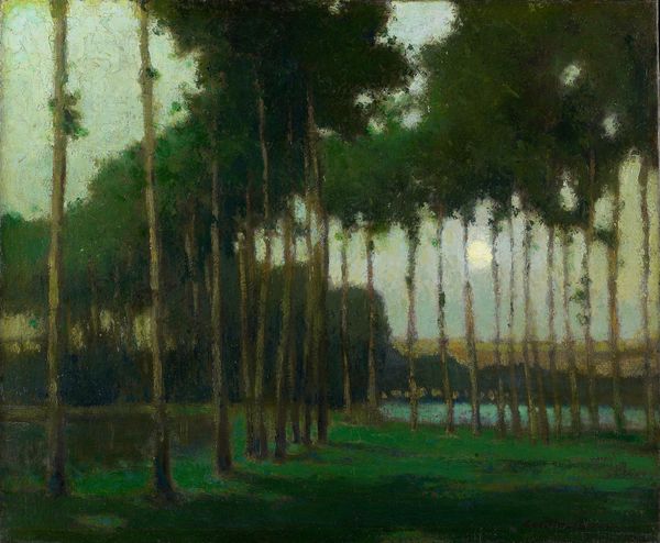 Curator: Today, we're examining Claude Monet's "Poplars on the Banks of the Epte," painted in 1891, an oil-on-canvas study of form and light. Editor: It's immediately striking; the elongated trees reach for a sky almost too vivid, that particular, restless blue that seems to press down rather than lift up. Curator: Note how Monet employs impasto to render the scene; thick daubs of paint give a textural depth, especially evident in the foliage. We can almost feel the weight of the humid air, and how form gives meaning to what he painted. Editor: Yes, and think about that location. Monet was deeply involved with the social landscape; his focus on capturing natural environments also reflects a concern for the changing rural landscape under the pressure of industrial advancement. The Epte was an axis for so many changes at this time. Curator: True. From a formal perspective, the verticality of the poplars contrasts dramatically with the horizontal expanse of the water and land. It creates a kind of visual tension. Note too how light modulates throughout. Editor: Right. But beyond formal beauty, I read tension in that contrast too. Those rigidly upright poplars almost feel like a silent, solemn picket line. Given the time, can we consider this work an assertion of the presence of rural communities? Curator: One might also observe the cyclical rhythm within Monet’s body of work; his return to similar subjects showcases a relentless pursuit of capturing transient moments through light and color. This focus has value beyond political context. Editor: Perhaps. Yet it’s also key to situate him, as an artist benefiting from bourgeois patronage, within the economic inequalities of late 19th century France. How does privilege inflect the way nature is not only seen, but valorized? Curator: A vital, important question to hold as we appreciate its interplay of tones. The chromatic arrangement in “Poplars” is subtle but effective in evoking a distinct emotional state. Editor: Definitely a lot to consider, formally and conceptually! Curator: Indeed, a potent study that prompts further questions and considerations.