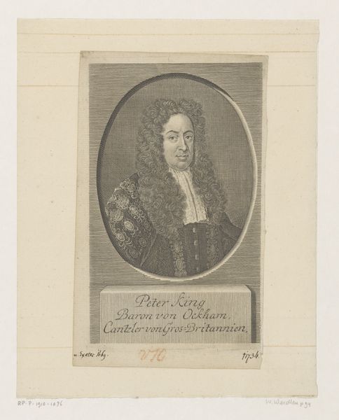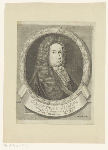 Curator: Let's take a look at this piece, “Portret van Friedrich Weise,” made sometime between 1697 and 1709 by Johann Christoph Boecklin. It's an engraving. Editor: My immediate impression is the level of detail Boecklin achieves with engraving. The texture of the hair alone suggests a commitment to realistic representation, while the limited tonal range creates a somewhat somber mood. Curator: Exactly! Think about the societal context. Prints like these were essential for disseminating images of important figures, playing a crucial role in shaping public perception and memorializing individuals. Weise, as a theologian, occupied an important place in the community. Editor: And that replication of images has fascinating material implications. How does mass production influence perceptions of value, labor, and authenticity? Boecklin had to skillfully translate likeness and status into a reproducible medium, influencing who got remembered and how. It’s not just art, it is also work. Curator: True, it makes me wonder about the power dynamics at play. Who commissioned this portrait? Who was the intended audience? Prints were more accessible than painted portraits, meaning a broader section of society could potentially engage with Weise's image, reinforcing his authority. Editor: The engraver's skill becomes a means of social production and visibility. Also, what specific tools did Boecklin use, and from where did they originate? Was he using specialized papers that lent to particular kinds of impressions and how did this production affect the artist? It gives a very interesting context to consider when studying Boecklin's portrait. Curator: I see it connecting to our understanding of Baroque-era social structures. By examining the circulation of such prints, we gain a more complete understanding of the period’s cultural values and systems of power. Editor: Thinking about it, tracing the materials involved in its creation – the paper, the ink, the tools – illuminates the interconnected economies and labor practices that made this image possible. Curator: Thanks. I now have a fuller sense of this print's role in circulating both image and idea. Editor: And now I appreciate the intense physical labour and craftsmanship required to create it.