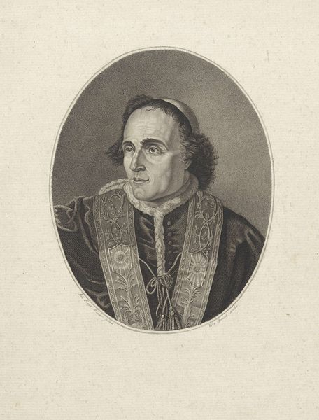 Curator: This is Martinus van Looyen's "Portret van Pius VII," an engraving created sometime between 1806 and 1814. It strikes me immediately; it feels remarkably modern despite depicting a figure from the early 19th century. The crispness of the lines and the contrasting grayscale give it an almost photographic quality. Editor: My first thought is somber; his expression and the limited palette evoke a sense of restrained authority and perhaps even resignation, given the historical context. Van Looyen was working during a tumultuous period for the Papacy, marked by Napoleon's dominance. How does the choice of engraving – a process involving meticulous labor and replication – affect our reading? Curator: Absolutely. The medium is vital here. Engraving, unlike painting, is an inherently reproductive technique, implying wider distribution and a public audience. The print format democratizes access to the image of the Pope, though still, the creation involves skilled craftsmanship. What were the typical printmaking processes and workshops like at that time? Did van Looyen operate independently or within a larger publishing house? This would speak to the dissemination of papal imagery and its role in shaping public perception. Editor: And crucially, whose perception? Who would have been able to access such prints, given literacy rates and socioeconomic barriers? Also, Pius VII's papacy was deeply intertwined with political upheaval and shifting alliances. His capture and imprisonment by Napoleon must have weighed heavily, both on the man himself and the imagery produced of him. To what extent does the engraving, with its austere presentation, acknowledge or obscure this political reality and how does it solidify the role of Pope? Curator: Precisely. The tension between the objective medium of printmaking and the highly symbolic subject matter creates a fascinating dynamic. Each line is deliberately etched, contributing to a controlled and reproducible image of power. Yet the inherent limitations of the medium – the grayscale, the flatness – perhaps unintentionally humanize Pius VII. Editor: Indeed. Van Looyen’s print exists as a cultural object deeply rooted in the sociopolitical environment. Thinking about audience and consumption transforms this work from simply a portrait into a piece of evidence. Curator: Considering the conditions of its creation reveals that much! Editor: It allows us to reconsider power as something constructed and challenged, even within seemingly straightforward portraiture.