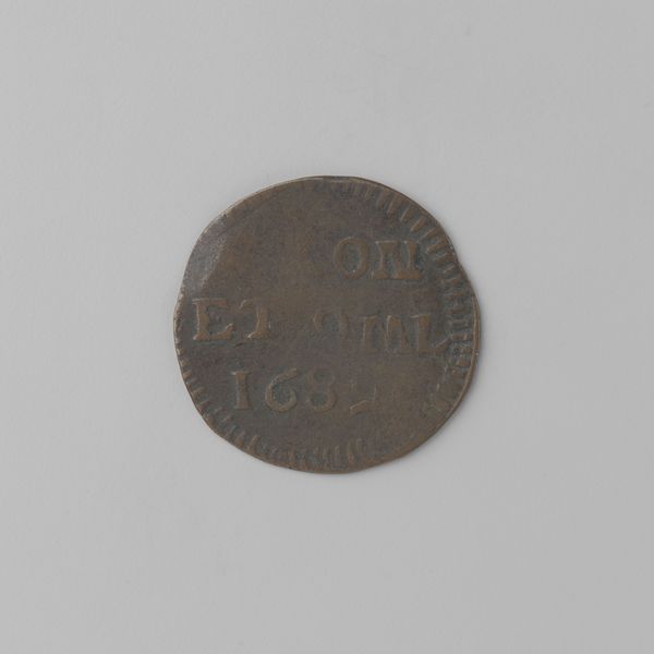 This Westfriese duit was crafted in 1663 by the governing body of West Friesland. Notice the worn, tactile quality of the metal; its circular form is softened by the irregularities of age and use. The raised inscription "West Frisia 1663" segments the surface, creating a textured topography on a miniature scale. The arrangement of text isn't merely informational, it’s foundational. Each letter is a deliberate mark, contributing to the overall composition and challenging our understanding of value, both monetary and symbolic. The coin prompts us to consider semiotics: How do simple shapes and inscriptions function as signs within a cultural and economic system? The coin’s design invites us to question how such tokens create and sustain social structures. Consider how its small size belies its function as a tool of power and exchange. This tension between form and function underscores the complex relationship between materiality, meaning, and authority.