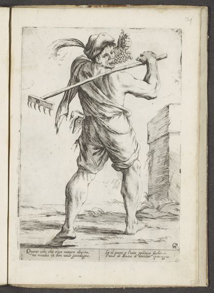 Giuseppe Maria Mitelli created this etching, "Druivenplukker," in the 17th century. A figure strides forward, a rake slung over his shoulder, a cluster of grapes held to his mouth. These grapes are more than mere fruit; they are symbols deeply intertwined with the iconography of Bacchus, the Roman god of wine, ecstasy, and fertility. Consider the Bacchic processions of ancient times, where grapes, wine, and frenzied revelry were central. This image evokes those primal, ecstatic experiences, connecting us to a rich vein of cultural memory. Notice the figure's unbridled consumption of the grapes. This act echoes the transgressive nature of Bacchic rituals, where boundaries blurred, and inhibitions dissolved. The grapes, in this context, become a potent symbol of transformation, of the intoxicating power that can both liberate and enslave. Across centuries, the grape motif resurfaces, each time carrying echoes of its past. In Renaissance paintings, it might signify abundance and divine favor. Here, in Mitelli's print, it embodies a more complex interplay of pleasure, labor, and the intoxicating allure of the senses. It is a reminder of the cyclical nature of symbols, their power to engage us on a subconscious level, and their enduring presence in the collective human psyche.