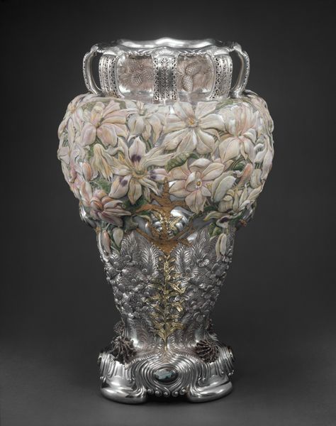 This vase at the Minneapolis Institute of Art immediately strikes one with its gilded opulence and carefully considered geometry. The metallic sheen, luxurious in its intensity, covers the surface with intricate designs that bring our attention to the vase’s form, where symmetry reigns supreme. Notice how the cylindrical body transitions into a flared neck, and how the handles echo each other, creating balance. This structure is not just ornamental, it's communicative. The floral vignette acts as a rupture within this otherwise rigidly ordered system. The flowers introduce an element of the organic, a soft counterpoint to the hard geometry. The vase, therefore, becomes a dialogue between control and abandon, echoing structuralist principles of binary oppositions. The very act of placing flowers in a vase suggests a framing of nature, an attempt to contain the wild within the boundaries of culture. This tension between the artificial and the natural is a key element, inviting ongoing interpretation.