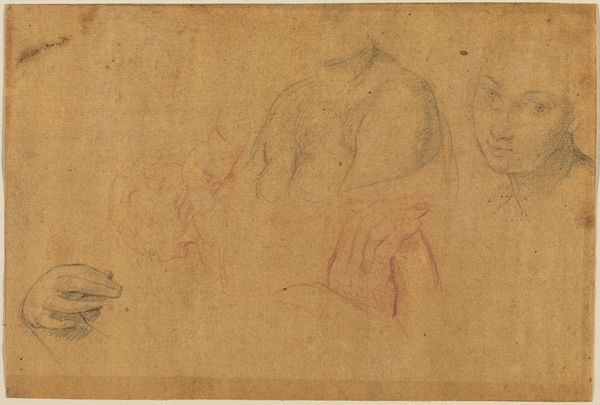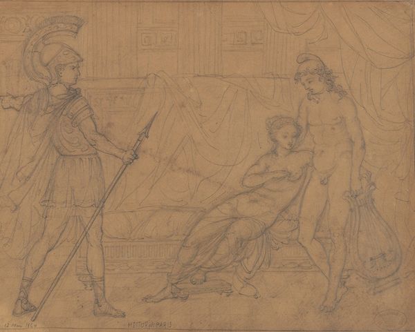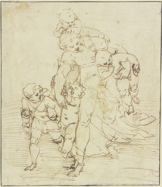 Curator: Here we see John Flaxman's drawing, dating to around the 1790s, entitled "Otus and Ephialtes Holding Mars Captive." Editor: It’s a very linear drawing, all pencil. The composition is stark, classical, but with a palpable sense of suppressed violence lurking just beneath the surface. The defeated Mars almost disappears into the lower portion. Curator: Indeed, Flaxman was a key figure in the Neoclassical movement. He deeply admired classical antiquity, drawing inspiration from Greek mythology. This work illustrates a scene from the stories, where the giants Otus and Ephialtes imprison the god of war. What resonates here is the symbolic inversion of power dynamics. Editor: And the material means underscore this tension. The hard, unyielding pencil creates this world of firm outlines, even constraint. But it's precisely in those linear structures—the chained limbs, the stark geometry—that the drawing finds its expressive force. It’s not just a mythic tale, but an exploration of power rendered materially visible. The chains are made by human hands. Curator: I find that it invites us to consider representations of masculinity and dominance. Mars, usually the emblem of martial power, is rendered utterly vulnerable and powerless. He's literally chained by these giants, offering an interesting commentary on power structures. Who is considered strong? Editor: Precisely, and by what measure? Consider the implications for gender. The drawing speaks volumes about strength, vulnerability, and the instruments – quite literally in this case with those chains – through which control is exerted, challenged, and perhaps ultimately, subverted. What were the working conditions, the foundries of this metal? This adds more context for reflecting on contemporary injustices through labor. Curator: Looking at the historical context during the late 18th century, which was fraught with revolutions and political upheavals, the piece provides social commentary. In light of the French Revolution, the drawing can be interpreted as a visual meditation on overthrowing established authorities. Editor: Yes. Thank you, it seems so! Curator: The layered meanings contained in Flaxman’s rendering enrich our contemporary lens. It continues to teach us about how images shape discourses around political and interpersonal relations of control.