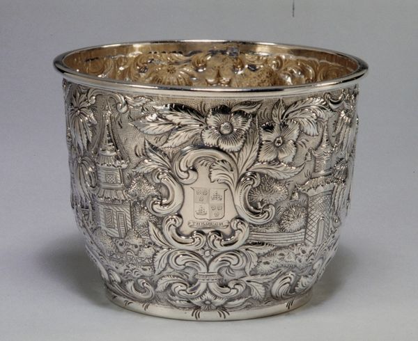 Curator: Well, isn’t that striking? It’s sort of austere, despite all the flourishes. Editor: That’s exactly what caught my eye! All that silver, that hammered texture... it's almost brutally elegant, isn't it? Like a medieval goblet with a secret punk rock heart. Curator: Indeed. This piece, a two-handled cup, is attributed to Timothy Ley who was active in the late 17th century. It's a fascinating example of early American silver craftsmanship, housed right here at the Harvard Art Museums. Editor: Those handles are like stylized twigs, and then you have this ornate cartouche with "M & S"... a betrothal cup, perhaps? It speaks of tradition, family—a shared history. Curator: Precisely. It reflects the social customs of the time, these cups were often presented as gifts, marking significant life events. The form harkens back to European precedents, but with a distinct New World touch. Editor: I keep thinking about the hands that held this cup, the stories it could tell... Curator: Visual symbols are vessels of memory. Editor: Beautifully put. It really makes you consider the weight of history in such a tangible way.