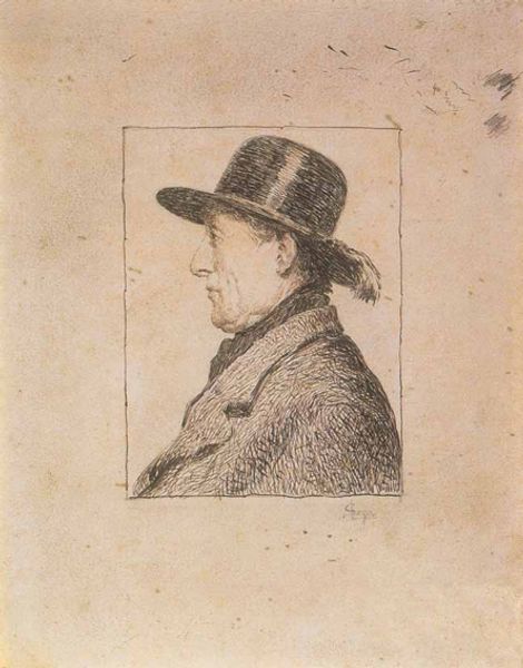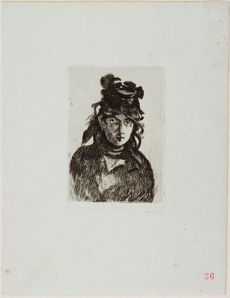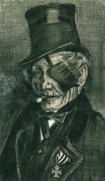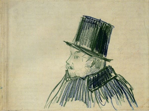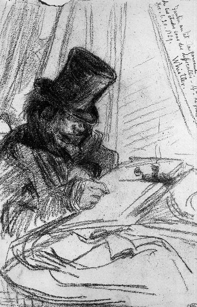 Curator: We’re looking at Vincent van Gogh’s “Orphan Man with Top Hat, Head” from 1882, a drawing rendered in charcoal and pencil. Editor: He seems so somber. The monochromatic palette definitely amplifies a feeling of bleakness. The tight crop really forces you to confront the man's isolation, as the gaze directs elsewhere from the viewer, detached, reflective perhaps? Curator: The restricted palette is key. Van Gogh deliberately constrains his tonal range to explore the structural forms. Look closely at how he uses hatching and cross-hatching to build volume, particularly in the man's coat and the cylindrical form of his hat. There’s an interplay between stark lines and smudged textures that creates a striking visual tension. Editor: Absolutely, but I can't divorce the formal elements from the implied social commentary. Van Gogh was deeply interested in the lives of the working class. Given the title and the time period, the artwork likely suggests some larger issues about alienation and poverty that came along with industrialization. He seems trapped in his circumstance and the societal forces at play. Curator: That might very well be true, though what's interesting is to compare the geometry of his form with a drawing by Seurat from a very similar time. Despite Seurat and Van Gogh having differing outlooks on life and perhaps varied beliefs and sympathies for the plight of modern man, they still looked at these themes through their artwork via very similar visual languages. Editor: To follow your line of sight, what seems visually akin also strikes a clear departure—it's the visible anguish embedded in the portrait, whereas other Realists’ goal was only to be 'objective' without taking sides in their depiction of urban realities. Here we see Van Gogh taking sides, or at least wanting to evoke feeling as much as accuracy. This image then, speaks not only to external societal pressures but also to a specific emotional response, a recognition of our shared humanity within such circumstances. Curator: Indeed. It is remarkable to see how this study in line and tone can deliver that. Editor: It's an intense image—a powerful fusion of technique and social awareness that continues to stir the heart and mind.