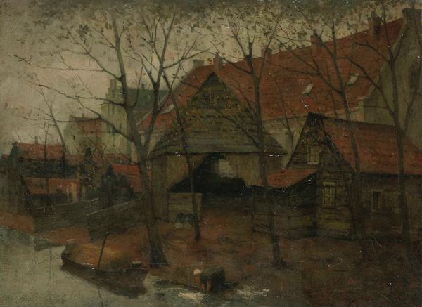 Eduard Karsen created this painting, "Houses in a Village," with oil on canvas. The somber palette immediately captures our attention. The composition, dominated by muted greens, browns, and greys, evokes a sense of quietude and perhaps even melancholy. Karsen masterfully uses a limited range of tones to create depth and atmosphere. Notice how the bare trees frame the buildings, their branches creating a delicate network of lines against the sky. The textures are subtly rendered, with the rough bark of the trees contrasting against the smooth walls of the houses. The artist's ability to convey mood through these formal elements is striking. The painting prompts a feeling of introspection. The structural arrangement of forms and textures, reflecting a deeper engagement with the poetics of the everyday, emphasizes the way meaning resides not just in what is depicted, but in how it is depicted.