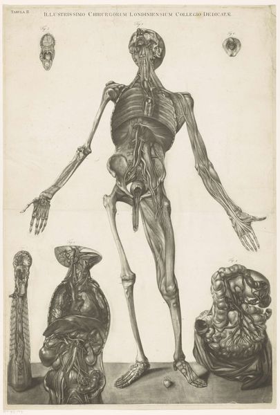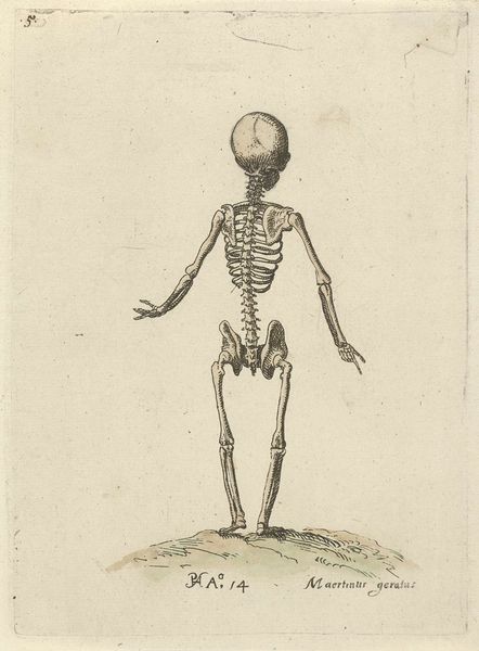 Curator: Pieter Feddes van Harlingen created this ink, pencil and paper drawing entitled “Mannelijk skelet, van voren gezien” in 1614. It is currently held in the Rijksmuseum collection. Editor: The somber feeling of this sketch certainly strikes you. Its frontal perspective gives us an undeniable view of our mortality; there's nowhere to hide. Curator: The realism depicted in the skeleton provides a visual understanding of human anatomy for artists during that period, who were keenly interested in understanding the relationship between what is seen and what can not be seen with the naked eye. Editor: Yes, but the very directness of the presentation seems almost confrontational; look at how precisely the lines are structured. It does feel a little uncanny. Don’t you agree? Curator: Perhaps; however, the artist also conveys a symbolic rendering that provides both narrative and academic detail. Take the positioning of the figure itself. This lends not only insight but a framework from which the artist could work. Editor: From a contemporary view, it’s intriguing to note the somewhat simplified and stylized structure. A modern artist would push for photorealism. Is it that earlier artists were less technically skilled or do we value different aesthetic elements? Curator: We can certainly argue that the shift we see in art occurred, in part, when science evolved. Photography changed the nature of what the public could see; that arguably made realistic drawing somewhat irrelevant over time. Editor: So, while seemingly direct in its anatomical representation, this piece also signifies a broader historical and cultural narrative in the transition toward greater realism and changing societal attitudes. I like the visual rigor here in particular. Curator: Indeed; looking at "Mannelijk skelet, van voren gezien", through the passage of time helps the modern viewer develop a lens toward understanding artistic aims alongside human endeavor. Editor: The starkness of this image is a potent reminder of how art allows us to visualize mortality while subtly marking time’s passage; this quiet piece gives so much for all to reflect.