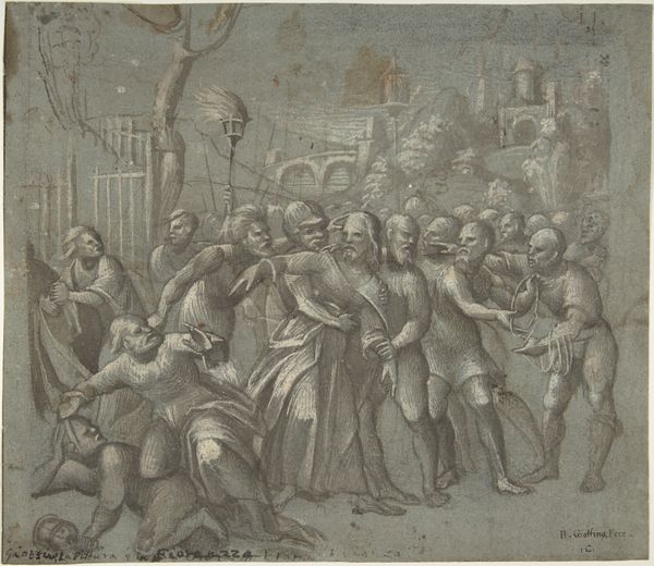 Benjamin West made this drawing, Jephthah's Daughter, with pen and brown ink, heightened with white gouache over graphite, on blue paper. The blue ground of the paper shows through the drawing, creating a cool tone to the scene. West has used the pen to sketch out the figures in quick, loose lines. The brown ink is used to define the forms and create shadows, while the white gouache highlights the figures, giving them a sense of volume. The process allows the artist to create a dynamic and dramatic composition, capturing the emotional intensity of the biblical story. The drawing’s medium gives it immediacy, making it a medium for working out ideas and experimenting with composition. West was not afraid to blend the conventions of high art with those of craft. By giving prominence to the materiality of the work, West seems to be asking us to consider the drawing not just as a representation, but as an object in its own right. This helps us see the work in its full complexity, challenging traditional distinctions between fine art and craft.