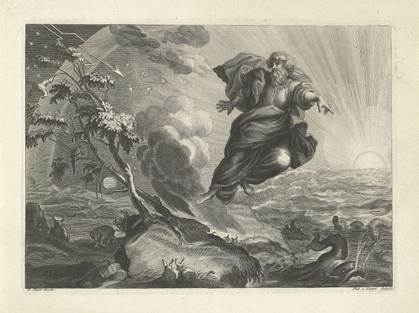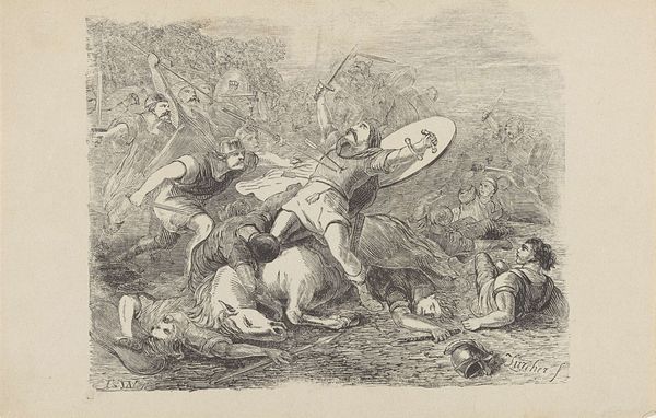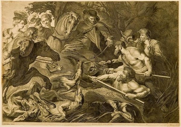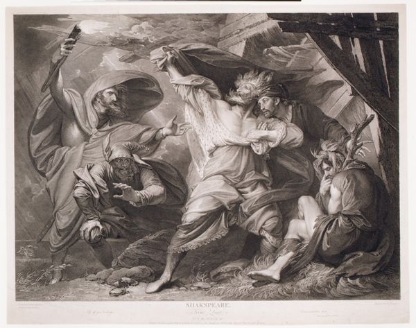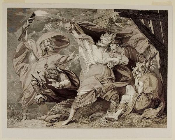 Curator: William Sharp, born in 1749, rendered this dramatic scene, "King Lear: Act III, Scene 4." It's currently held in the Harvard Art Museums. Editor: What strikes me is the stark contrast—the raw, frantic energy of Lear amidst the relative stillness of the figures around him. There's an almost operatic feel to the composition. Curator: Absolutely. Sharp’s piece reflects the 18th-century fascination with Shakespeare, but also the increasing interest in portraying intense emotions, especially within a historical context. The image helped popularize the play’s themes of madness and authority. Editor: Note how the light catches Lear's bare chest and wild expression; it's masterful, emphasizing his vulnerability against the shadowy background. Semiotically, this positioning creates a hierarchy of suffering, placing Lear at its apex. Curator: And the surrounding figures, holding torches and huddling, really underscore the social upheaval Lear's madness signifies. This scene was often interpreted as a commentary on societal breakdown. Editor: Looking closely, the medium itself, likely an engraving, contributes to the sharp, almost brittle quality of the scene. It mirrors the tempestuous mood perfectly. Curator: It’s a testament to Sharp’s skill how he distilled the political and social anxieties of the time into such a powerful visual narrative. Editor: Indeed, and the formal devices he employs elevate it beyond a mere illustration, making it a lasting meditation on human frailty and the power of art.