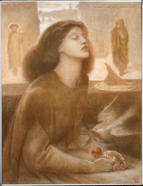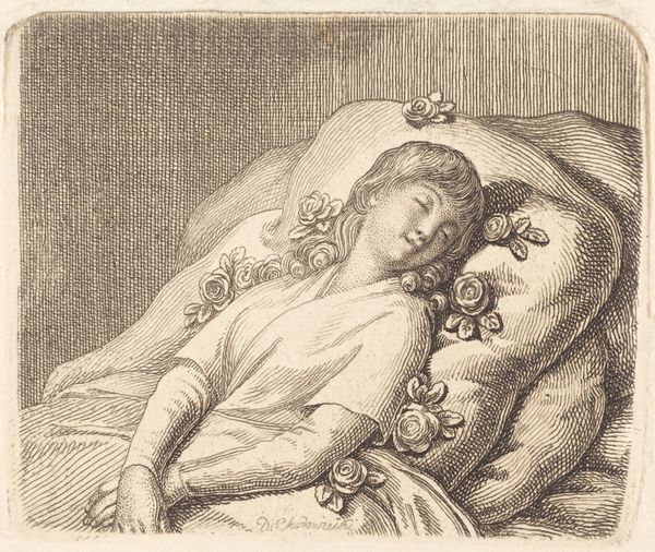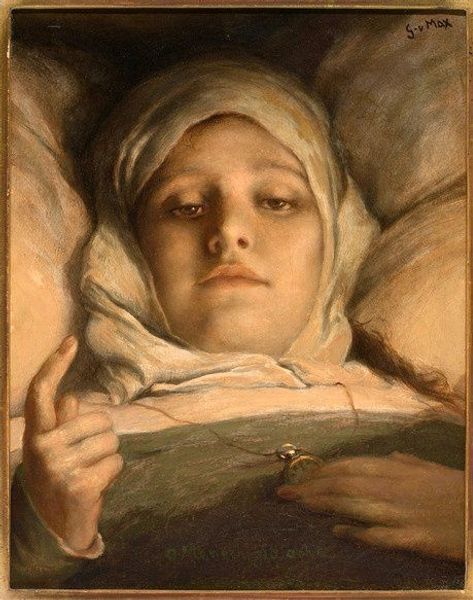 Curator: Charles Herbert's "Study of the Head of the Sleeping Saint Ursula, after Carpaccio, in the Academy of Venice," presents us with a captivating moment of repose. Editor: It’s so serene! The way the light falls on her face, almost dreamlike. It makes you wonder what she's dreaming about. Curator: Herbert's work functions as a study, focusing on the artistic process. The medium itself-- its materiality-- invites us to consider the labor of art, the act of imitation, and the cultural value placed on these reproductions. Editor: I love how intimate it feels, though. Like we've been granted access to a private, sacred space. I find that detail on her sleeve particularly striking, like delicate bandages. Curator: Consider the source, Carpaccio, and the societal implications of canonizing art through replicas like this. Herbert’s choice of materials and technique also reinforces the artistic lineage. Editor: It feels like a gentle whisper across centuries; it's really lovely. Curator: Indeed, tracing the means of its production, from inception to realization, reveals so much. Editor: Absolutely. A lovely glimpse into the creative process.