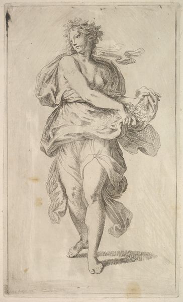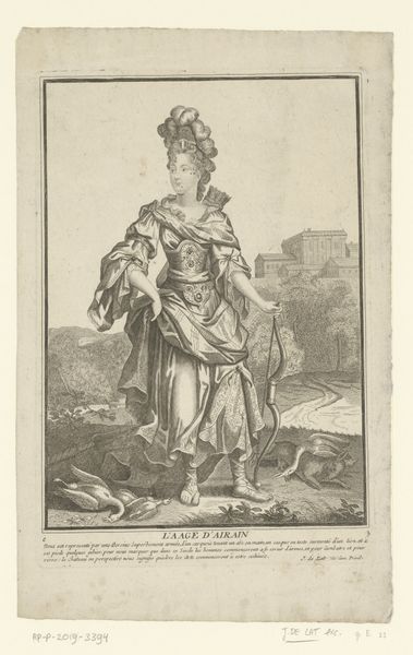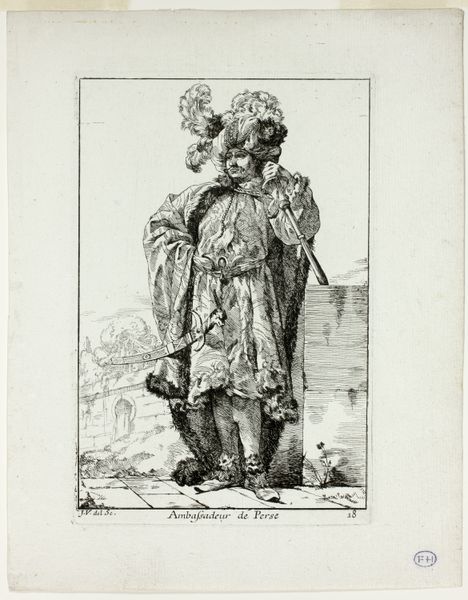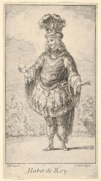 Curator: Standing before us is "Habit d'Ixion," an engraving created between 1716 and 1726 by François Joullain. Part of a series titled 'New designs for costumes,' it currently resides here at the Metropolitan Museum of Art. My immediate impression is a mix of amusement and slight bewilderment at the attire. What's your take? Editor: Well, I'm immediately struck by the inherent theatricality, even campiness of it. The ridiculously oversized feather in the turban, the short, bulbous skirt—it reads as a blatant display of performative masculinity, yet undermined by the sheer absurdity of the fashion. Curator: Indeed. The subject, dressed as Ixion from Greek mythology, offers insight into the role of costume in stage productions of the Baroque era. This wasn't just clothing; it was a powerful symbol of status, spectacle, and storytelling meant to impress audiences. Ixion, bound to a flaming wheel for his transgressions against Zeus, is here strangely… defanged. Editor: Exactly! Here’s where things get interesting. Joullain, by designing this flamboyant "Habit," isn't merely showcasing a costume; he's participating in the cultural construction of power and gender. Notice how the sword is almost comically small in proportion to the rest of the getup, it undercuts the impression of military authority or dominance we might associate with the symbol. Curator: The engraving technique itself adds another layer. The fine lines and meticulous detail almost create a sense of hyperreality. Each pleat, feather, and buckle is rendered with precision, drawing attention to the artifice. It is almost a flat plane of tonality in its stark presentation and the lack of dynamism adds to the reading as 'removed'. Editor: Precisely. By showcasing this opulent yet slightly ridiculous representation of a mythological figure, Joullain’s print unintentionally pokes at the very foundations of authority. And perhaps it hints at the precarity and performance that is any symbol of cultural domination, whether played out in myth or monarchy. Curator: An interesting point to consider the political climate in that epoch. Joullain presents this figure removed from the context. With Ixion unbound he represents a more free and available reading for this work. This really gives a new perspective into its place within that visual and performance paradigm of the era. Thank you for your insight. Editor: My pleasure, thinking about those subtleties and recontextualization truly enhance how we perceive visual objects and symbols.