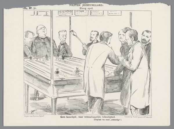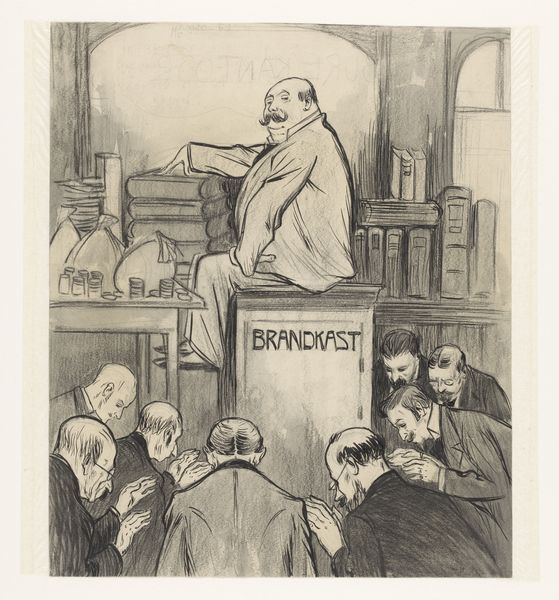 Editor: So here we have Jan de Waardt’s, "Vóór Restaurant Royal - den Haag, februari 1896," a drawing using pencil and pen. The scene feels incredibly candid, almost like a quick snapshot capturing a mundane moment outside a fancy restaurant. There's a stark contrast between the well-to-do diners inside and the street workers outside. What do you see in this piece, beyond the obvious class divide? Curator: It’s like a stolen glance, isn’t it? De Waardt wasn’t trying to paint perfection; he wanted to capture the raw, unfiltered truth of daily life. What intrigues me is the box – “Restaurant Royal” emblazoned across it. Is it refuse? Scraps for the less fortunate? Or perhaps a symbol of the Royal's leftovers trickling down? Makes you wonder what stories those cobblestones could tell. Editor: I hadn’t considered the box itself as a focal point. It does kind of sit right in the foreground, smack dab in the middle of the image. I wonder if the artist saw beauty, or at least interest, in the everyday hustle. Curator: Absolutely. Beauty isn't always about flawless symmetry or idealized subjects, it is in that gritty detail. Look at the body language: each figure absorbed in their own world, their lives intersecting only momentarily. It’s this honest portrayal of human existence that makes it so compelling, wouldn't you agree? Almost like street theatre caught on paper. Editor: Definitely. I appreciate how this piece manages to capture a sense of social commentary with such delicate linework. It almost feels understated, yet so powerful. Curator: And that’s the brilliance of it, isn't it? It doesn't shout; it whispers, inviting us to lean in and listen closely to the unspoken narratives. I love that!