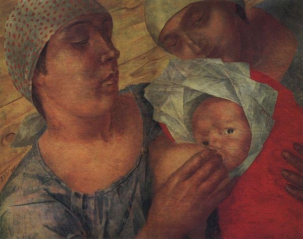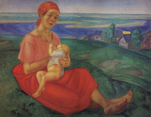 Kuzma Petrov-Vodkin painted this image, called 'Mother', with oil, at some point in his career. I like how the whole thing kind of glows, like she's lit from within. The colors are so interesting; they're not naturalistic, but they feel right. The red skirt, the blue blouse, it's all very deliberate. I'm drawn to the mother's face, there's a strength there, but also a kind of vulnerability. The brushstrokes are visible but delicate, like he's trying to capture a fleeting moment. Look at her hand holding the baby; it's painted with such care, you can almost feel the weight of the child. It's a very tender and intimate scene, but it also has a certain formality to it. Petrov-Vodkin reminds me of Paula Modersohn-Becker, they both find ways to take the every day and make it monumental. It’s a painting that invites you to slow down and really see. There's no one right answer, it's all up for grabs.