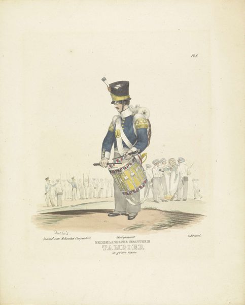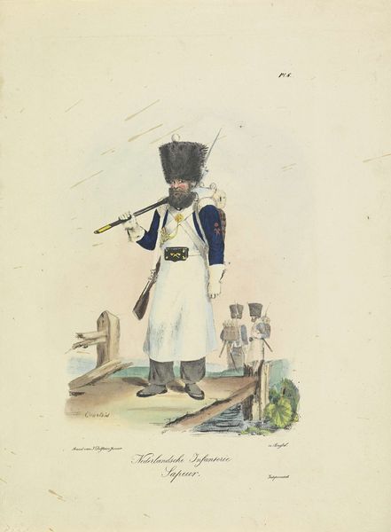 A. Courtois made this print between 1820 and 1825, depicting a Sapper in grand uniform. The figure’s most striking feature is the large fur cap, a symbol resonating with primal, almost barbaric power. Consider how such a cap has been used in other times and places: think of the ceremonial headdresses of ancient warriors. It’s a display of raw strength meant to strike awe and perhaps fear. This cap is more than mere fashion; it is an emblem of might, passed down through generations. The apron worn by the sapper is unexpectedly clean, and it seems to defy the chaos of war, reminding us of the ritualistic purity often associated with sacrificial roles. The symbols within this image are not merely aesthetic choices; they engage our collective memory and subconscious understanding of power, sacrifice, and the performance of strength, constantly resurfacing and evolving through history.