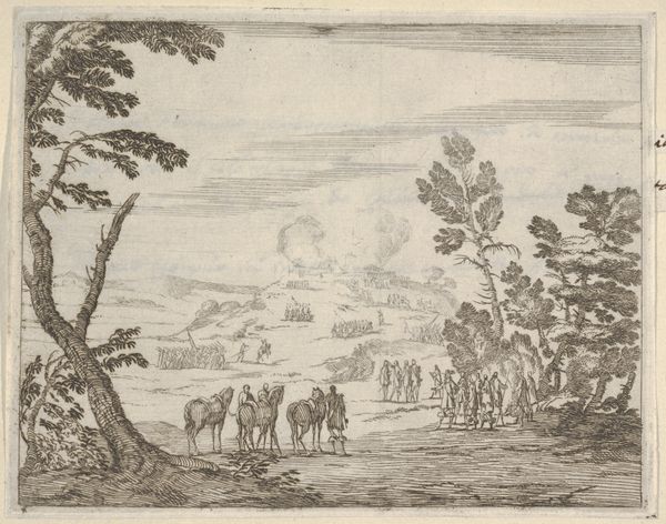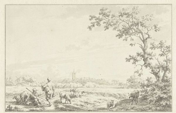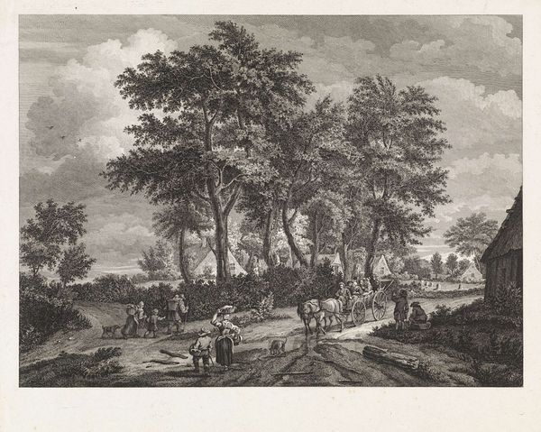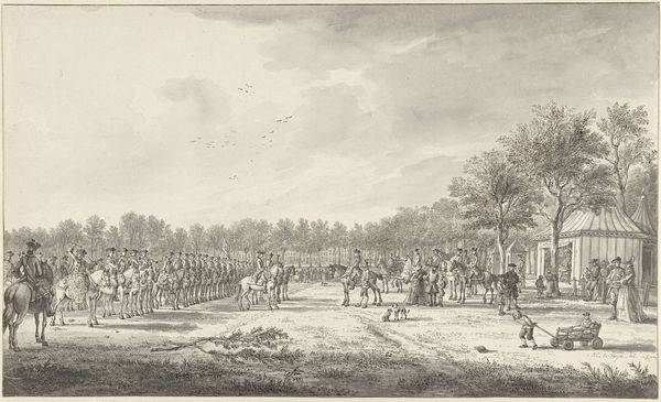 Editor: Here we have Roelant Roghman's "Winter Scene with Skaters," dating from around 1650-1655. It's a drawing done in pencil, ink, and watercolor on paper, and it really evokes the feeling of a bustling winter community. The muted tones create such a stark and, honestly, a little bleak atmosphere. What do you see in this piece beyond just a depiction of a winter scene? Curator: Beyond the surface, it's vital to understand these Dutch winter landscapes within their socio-political context. The 17th century saw a 'Little Ice Age,' and these frozen canals became public spaces, blurring social boundaries, literally solidifying a space for interaction. This image shows that—a communal space made possible by environmental change. Consider how class distinctions may have been temporarily dissolved, yet, the presence of figures pulling sledges with what appears to be heavy load hint at an unequal labor dynamic even in leisure. What stories are absent from this seemingly quaint depiction of community? Editor: That's interesting. I hadn't thought about the socio-economic implications within a landscape like this. Does the fact it’s a drawing change your perspective at all? Curator: Absolutely. A drawing offers intimacy, a sense of immediacy not always found in larger, more formal paintings. Think about the power dynamics implicit in accessibility. This work now resides in the Rijksmuseum. Who historically had access to art, and who was excluded? What does it mean to display something that was once created, potentially, for private contemplation into the public domain? This artwork invites us to ponder these questions. Editor: So, by viewing this, we are implicitly questioning those structures, opening up that dialogue by looking at its provenance. Curator: Precisely! Seeing it involves a continuous negotiation with both past and present societal structures, challenging us to reflect critically on whose stories are told and whose are not. Editor: This has really given me a completely fresh perspective on winter landscapes; I'll never see one the same way again. Curator: Excellent. Questioning is the first step to seeing anew.