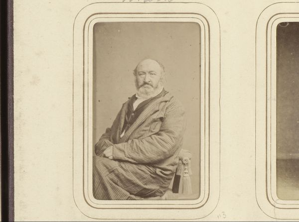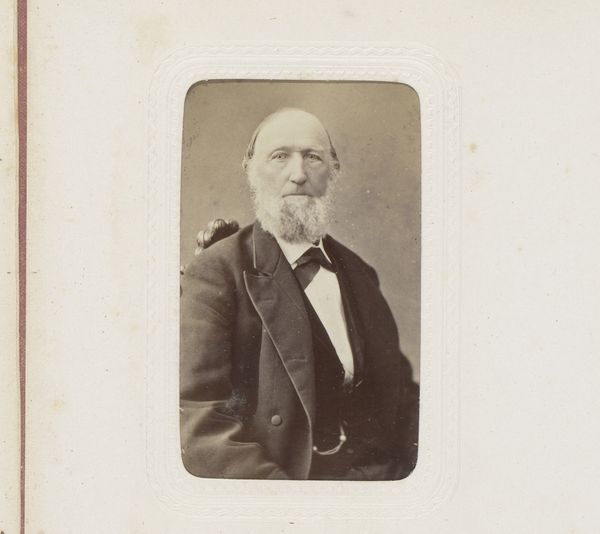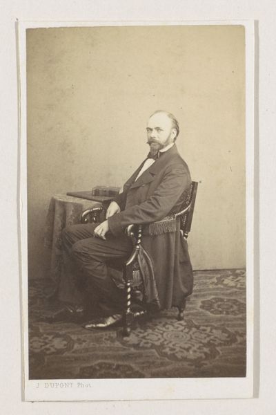 Editor: Here we have a photographic portrait, titled "Portret van een zittende man met snor en bakkebaarden" – Portrait of a seated man with a moustache and sideburns. It was taken by Moriz Ludwig Winter sometime between 1850 and 1885, using the albumen print technique. I find it strikingly austere; what strikes you about this piece? Curator: The albumen print, that sepia tone, already evokes a sense of the past. Consider the iconography of the beard and sideburns. They represent virility, status, and a certain self-possession. Note how the ornate chair frames him; a throne of bourgeois identity. What message do you think the sitter wanted to convey? Editor: I hadn’t thought about the chair as a throne, that’s fascinating! Perhaps he wanted to appear powerful and distinguished, a man of substance. Curator: Exactly! These visual cues are potent symbols, consciously adopted. Now, look closer at the way he holds his hands. How does that gesture contribute to the overall impression? Does it project anxiety, confidence, or something else entirely? Editor: His hands seem relaxed, maybe even a little bored? He is self-assured, used to sitting for portraits. But what do you think about the framing and the light? Curator: The framing is tight, concentrating on the sitter's presence. Light sculpts his face, accentuating the lines of his features. Consider what the advent of photography did to portraiture and identity. Did it democratize image making, or simply perpetuate established power structures? What do you think? Editor: I see what you mean! Maybe it both democratized and perpetuated. It made portraits more accessible, but the visual language of power remained in play. This image makes me think about all the family albums sitting in attics… Curator: A powerful insight. Each photograph a carefully constructed performance of identity and aspiration frozen in time. The family album, then, becomes a cultural artifact, a collection of coded messages across generations. Editor: I never considered how much intentionality and cultural encoding can be embedded within a seemingly straightforward portrait. I'll definitely look at old photos differently from now on!