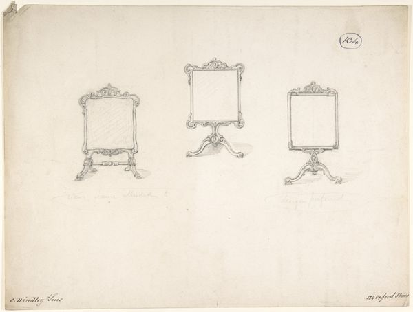 This is a pencil on paper artwork titled, "Designs for Four Chairs," by Charles Hindley and Sons. The composition is structured around the repetition of a single motif: a chair. Each chair is rendered with precision, emphasizing its geometric form. Notice how the fine pencil lines create not just shape but also texture, implying the materials from which these chairs might be constructed. The chairs exist in a shallow depth of field, flattening them and drawing attention to the lines. The chairs evoke a sense of order and design, reflecting the 19th-century interest in functionality. The semiotic play here relies on the cultural understanding of chairs as functional objects, yet these designs elevate them to aesthetic forms. The chairs suggest a challenge to fixed meanings by presenting common objects as subjects of artistic exploration. Ultimately, this work functions as more than just a design proposal, it asks us to consider how everyday objects can become art when their structure and form are celebrated.