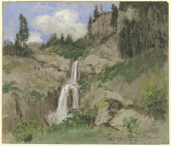 Curator: This watercolor, titled "Waterfall", comes to us from the hand of Denman Waldo Ross. Editor: Ooh, my first thought is it feels melancholic. Like a memory fading into mist. Curator: Ross was deeply involved with the Arts and Crafts movement, promoting the idea of accessible beauty for everyone. Editor: You can see that. It's unpretentious, immediate, capturing a fleeting moment. I love how the water seems to dissolve into the rocks. Curator: He was also an influential figure at Harvard, advocating for design principles and color theory. His teachings shaped generations of artists. Editor: I'm no art historian, but I sense an artist who is trying to find the sublime in the commonplace. A quiet beauty. Curator: Yes, and his aesthetic theories were intertwined with progressive social ideals. He really believed in the power of art to elevate society. Editor: Well, I feel elevated. It's a simple, powerful work. It makes you want to jump in that cold mountain pool.