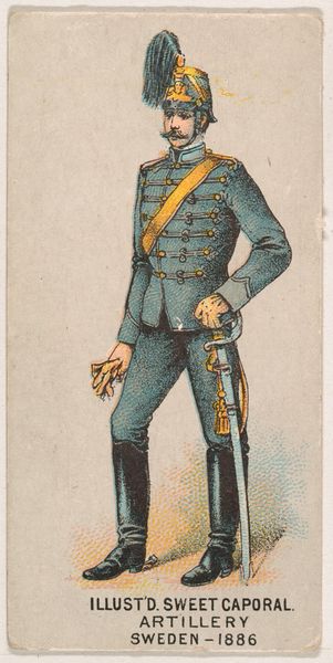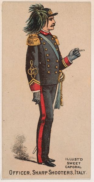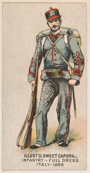 This is Admiral, Spain, 1886, from the Military Series (N224), a promotional artwork crafted by the Kinney Brothers Tobacco Company using lithography. The composition is dominated by the figure of a Spanish admiral, rendered with precise lines and vibrant color. The artist's selection of dark blues and reds, accented by the gold braiding, creates a visual hierarchy, drawing the eye to the admiral's face and the ornate details of his uniform. Consider how the lithographic technique, with its capacity for detail and color fidelity, supports the commercial function of the image. The intent is not just representation but also persuasion. Each element, from the cut of the admiral's coat to the set of his jaw, presents an image of authority and elegance, subtly associating these qualities with the Sweet Caporal brand. This interplay between image and commerce highlights how aesthetic forms are often intertwined with broader systems of value and exchange.