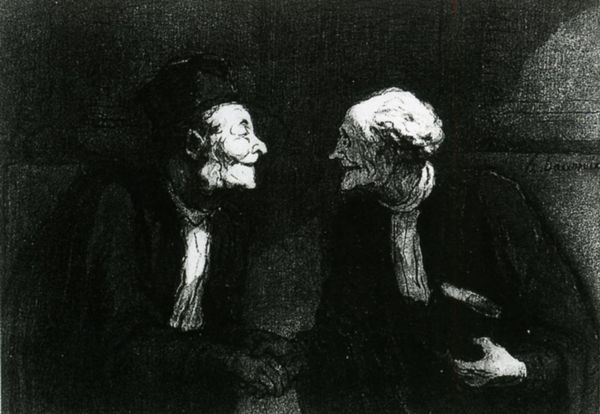 Editor: This is Francisco Goya's "Two Old Ones Eating Soup," painted around 1823. The raw, almost grotesque depiction is really striking. What’s going on here? What can you tell me about this piece? Curator: Goya created this towards the end of his life, in a Spain wracked by political turmoil and social unrest. Think of the suppression of liberal movements under Ferdinand VII and a pervasive fear of societal breakdown. How might this socio-political environment affect an artist’s work, their choice of subjects, or even the way they portray the human figure? Editor: Well, I guess that sense of dread and maybe even societal decay is clear in this painting, I can see that the old people appear somewhat menacing or at least disturbing. Curator: Precisely! The grotesque imagery isn't merely aesthetic. Goya might be using the image of decaying elderly figures to comment on a society that is also decaying. In his series of Black Paintings there is no sense of beauty to be found; the colour is all browns and black with subjects bordering on madness or delusion. Does this not seem as if it’s speaking directly to his own anxieties about the fate of Spain? Editor: It’s interesting to consider the painting as a political commentary in this context rather than a straightforward depiction of old age, using disturbing images as cultural criticism of Spain during his lifetime! Thank you. Curator: My pleasure! Remembering context helps us ask deeper questions. How did the patrons of the art at the time feel, how did Goya portray previous rulers? These considerations give additional angles to understanding.