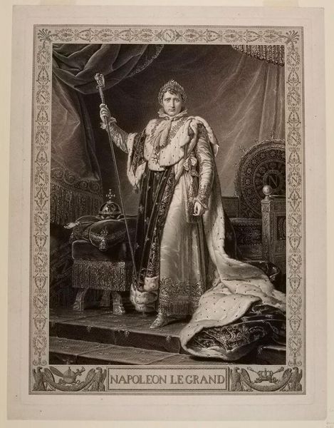 Editor: This is François Gérard's "Portrait of Napoleon I," an oil painting that seems to capture Napoleon in his full imperial glory. The colors are quite opulent, and there’s a lot to take in. What catches your eye when you look at this painting? Curator: I immediately notice the calculated use of symbolic imagery. Notice the laurel wreath? It's a deliberate reference to Roman emperors, a symbol of victory and authority. But it also speaks to Napoleon’s ambition to create a new Roman Empire. Do you see how the scepter reinforces that narrative? Editor: Absolutely. The scepter, the robe, the throne behind him – it's all very consciously constructed. Are these just symbols of power, or is there something more? Curator: Think about the psychological weight of these symbols, what they represented to people then and even now. Napoleon wasn't just presenting himself as a ruler; he was crafting a persona, carefully cultivating a myth. He used imagery to solidify his power. Consider how those images would impact culture in the years and centuries that follow. How does that relate to icons today? Editor: It makes me think about how modern leaders also use imagery and symbols to create a specific perception of themselves. Perhaps the intention behind an image can alter its power and symbolic nature over time. Curator: Precisely. An image, in isolation, is rarely the whole story. It is often a window onto a shared cultural memory or an aspirational vision, constantly evolving. Editor: I never thought about the historical memory connected to an image of someone. Now, looking at this piece, I understand how portraiture can communicate cultural narratives.
