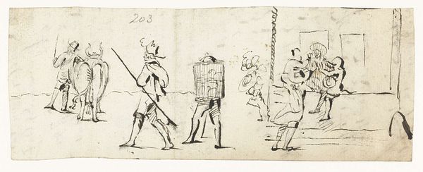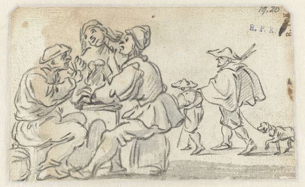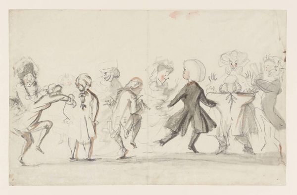 Editor: This is "Large Group of Women and Children," a pen and ink drawing on paper from around 1650 by Harmen ter Borch, housed in the Rijksmuseum. The initial feeling is… bustling! A really active scene. What strikes me is how much implied motion Ter Borch captures with so few lines. How would you approach analyzing its visual properties? Curator: Indeed, observe the linearity which dictates our perception. Ter Borch masterfully employs line weight and density to define forms and spatial relationships. Note the variation in line thickness—thicker lines ground the figures, lending weight and presence, while thinner lines suggest movement, fleeting gestures, capturing the dynamism of the scene. Editor: So it's almost like he’s creating a sense of depth through the conscious manipulation of line itself? Curator: Precisely! Moreover, the composition lacks a conventional focal point. Our gaze is invited to wander, drawn by the various groupings and activities depicted, giving an authentic glimpse of ordinary life. What compositional structures do you observe in the arrangement of figures? Editor: Well, there seems to be a progression, from denser groups on the left gradually thinning out towards the right. The characters are oriented in slightly different ways too. It's quite diverse, actually. Curator: Precisely! A diverse composition, deftly arranged through line. Reflecting on it, one appreciates Ter Borch's economical yet expressive mark-making. What are your concluding thoughts? Editor: It’s amazing how much visual information and activity can be conveyed with a simple pen and some ink. It shows how line alone, the foundation of drawing, can be profoundly powerful. Curator: Agreed. The power of the line and its intrinsic qualities allow us, as viewers, to activate the very scene.