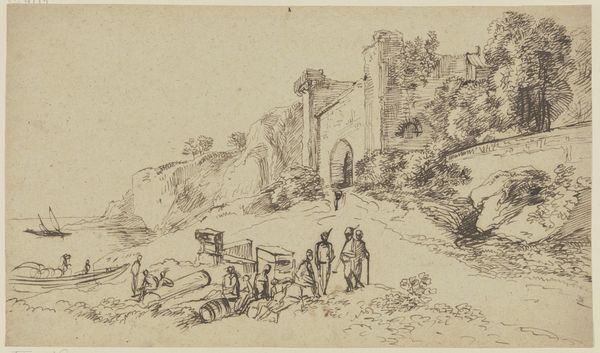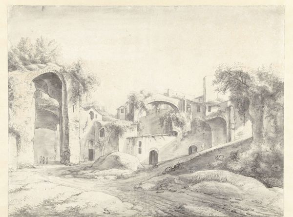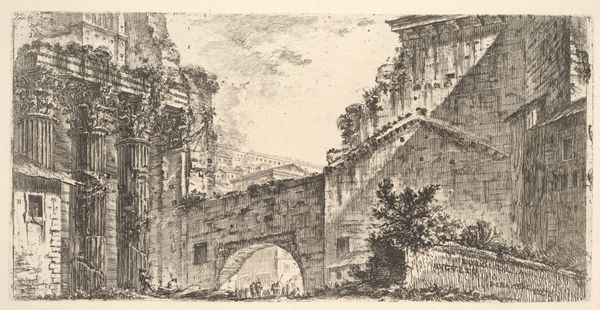 Curator: Jan Gerritsz van Bronchorst’s etching, “Titusbuen,” likely made sometime between 1603 and 1661, invites us to contemplate the ruins of a grand, perhaps idealized, cityscape. The work is held here at the SMK. Editor: It has a somewhat melancholic feel, doesn't it? The stark contrast in shading really emphasizes the crumbling structures. I see two figures in the foreground – are they simply passersby, or perhaps symbols of humanity's fleeting presence against the backdrop of historical decay? Curator: It's insightful of you to point that out. The architecture takes center stage here, a play between light and shadow. The actual Titus Arch in Rome was a monument to Roman imperial power. To show it decaying serves the question on whose power benefits? Editor: Absolutely, it could be a critique of power, a commentary on the impermanence of empires. What was Van Bronchorst's intention? The etching emphasizes the picturesque decay—rather romantic in a way, considering Baroque art’s tendencies toward drama. Curator: Considering its creation period, after the reformation and as other European powers wrestled for position, Van Bronchorst's exploration serves as a critique on religion's grip and Roman power. The focus on landscape also makes this about natural forces and its toll over human achievements. Editor: You’re right, its about a shift in what is prioritized as 'powerful.' Did the process of etching itself - a medium known for detail, allow him to engage critically with concepts of memory and time? Did it invite a more inclusive audience, outside wealthy patrons to participate in interpreting shifting views and ideology? Curator: Very likely. Prints allowed broader audiences to have access to art and ideas. Displaying architectural decay subtly questioned power structures, opening dialogues in public and academic spheres. Editor: Exactly, democratizing art. Considering those dialogues, Bronchorst doesn’t portray Titus’ arch triumphantly; rather it questions triumphant moments. It makes us remember history isn't made from conquerors' viewpoints but about understanding it from all sides and impacts. Curator: The decaying monuments certainly serve as silent critiques, resonating with broader themes in Early Modern Europe's ever-changing power paradigms. Editor: Indeed, "Titusbuen" gives more than a glimpse into physical spaces and structures. It opens up broader views to understand changes in European society from new vantage points.