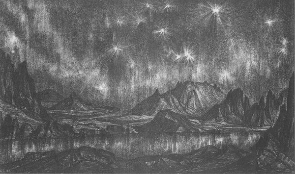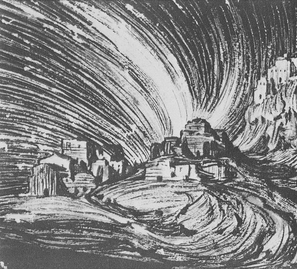 Editor: This is "Landscape. Sun." a pencil drawing made in 1923 by Konstantin Bogaevsky. There’s something dramatic about the landscape, almost theatrical, with the sun's rays. How should we think about this piece? Curator: It strikes me first and foremost as a work defined by its production. Look at the dense layering of the pencil strokes – a repetitive, almost obsessive action. Consider Bogaevsky in 1923, perhaps rationing his materials due to economic hardship. The humble pencil, a readily available and inexpensive tool, becomes the means to render this almost cosmic scene. Do you see how the labour involved in creating this work challenges our understanding of ‘landscape’ as purely representational? Editor: So, you're saying the materiality of the drawing itself speaks to the context in which it was made? That the economic factors shaped the artistic expression? Curator: Precisely. It's not simply about capturing a landscape, but about the act of *making* amidst material constraints. Bogaevsky transforms the mundane – the pencil, the paper – into a powerful evocation of nature. Also consider that this was during a period of upheaval. How might the scarcity of materials, the demand of industrial output during post-revolutionary reconstruction impact artistic labour? How can pencil drawing exist amongst that? Editor: That makes me see it in a completely different light! The deliberate, repetitive strokes now feel like a commentary on labour itself. Almost meditative. Curator: Exactly! The "high" art of landscape is democratized here through the "low" means of production. We understand so much more when we centre these considerations. Editor: This was incredibly insightful; thinking about art through the lens of material and production processes is so interesting! Curator: Indeed. Art becomes more relevant when considered through its physical creation. Thank you!