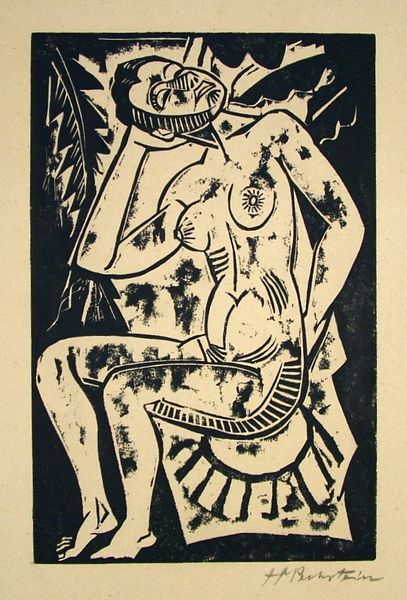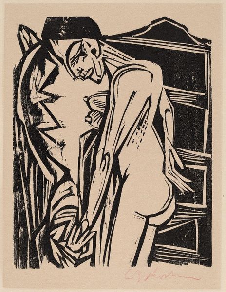 Curator: Ernst Ludwig Kirchner’s woodcut, “The Concert,” presents us with a raw, emotionally charged scene. Editor: It feels almost violent, doesn't it? The stark black and white, the jagged lines… a visual scream. Curator: The angular forms and deliberately crude carving contribute to that effect. Kirchner, as a leading figure of Die Brücke, embraced the expressive power of primal forms, seeking to tap into a deeper, more authentic emotional register. The abstracted figures, almost mask-like, suggest archetypes, not individuals. Editor: Are those stylized musical notes floating around the vocalist's head? It’s as if the music itself is a tangible, almost threatening force. What do you suppose the choice of a woodcut as a medium signifies? Curator: Woodcut, with its inherent roughness and directness, perfectly suits the Expressionist aesthetic. It rejects academic polish in favor of immediate emotional impact. The act of carving itself becomes a metaphor for the artist wrestling with the subject matter. Editor: It's certainly a powerful statement about the anxieties of modern life and the search for genuine feeling. Curator: Indeed, a visceral piece that transcends its medium, inviting us to contemplate the complex relationship between art, emotion, and society.