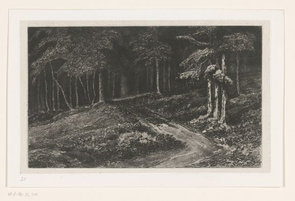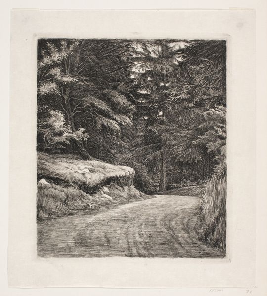 Carl Bloch made this print, "Bosweg", using etching, sometime between 1847 and 1890. Etching is an indirect process. The artist covers a metal plate with a waxy, acid-resistant ground, then scratches an image into that surface with a needle. When the plate is dipped in acid, the exposed lines are eaten away. The longer the plate sits in the acid, the deeper the lines become, and the darker they will appear when printed. This process is repeated, to achieve a range of tones. Consider the labor involved in the making of this print: the skilled work of the artist, of course, but also the extraction of the metal used for the plate, the making of the acid, and the production of the paper. Looking closely at the lines of the etching, we can appreciate the amount of work involved in producing this image of a woodland path. By attending to these aspects of making, we can more fully understand the value and meaning of this beautiful work.
