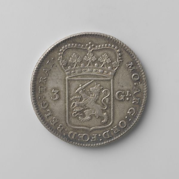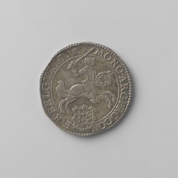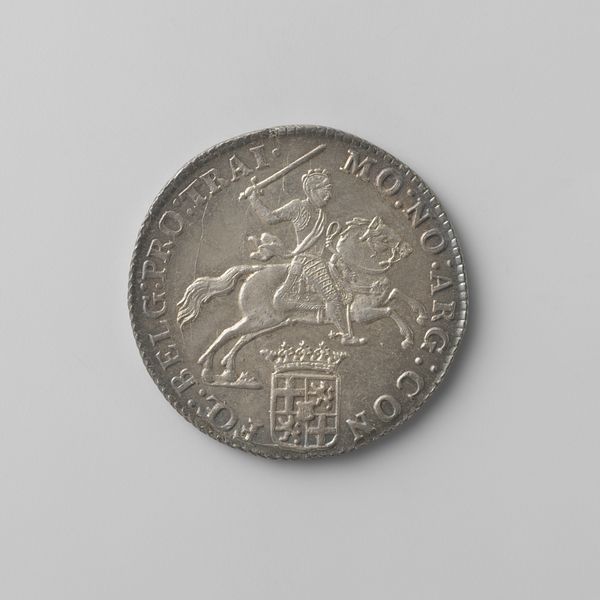 Curator: This is an image of the Utrechtse halve zilveren rijder, a silver coin dating back to 1785. It is a striking example of the application of neoclassical aesthetic in a minted form. Editor: The stark monochrome silver lends the image an almost ghostly feel, despite the militaristic equestrian figure dominating the space. It makes you think of ancient symbols but stripped down to their most material state. Curator: The equestrian imagery is deliberately invoking a very specific set of associations. Throughout history, the horseman figure on coinage has often been used to symbolize power, authority, and control, harking back to classical representations of emperors on horseback. What do you make of the sword being held up? Editor: Given that this coin originates from the late 18th century, it’s probably designed to showcase strength during a period of societal upheaval. And thinking of the metal itself—silver in particular has historically signified not only value but its ductility also symbolizes potentiality, the ability to be molded and traded. Curator: Indeed, the coin also includes a heraldic shield beneath the horse, which functions to reinforce the coin’s origin and legitimacy and serves as a clear, recognizable symbol of the Utrecht province itself, as a representation of its history, lineage and belonging. Editor: But consider this, Curator: silver also tarnishes. Like empires and ideas, materiality reminds us of how little control we exert on preservation through time, no matter how robust our systems seem to be. Curator: An important perspective. It speaks to a central concern of iconography: How can a fixed image carry meaning across generations and through social change? And what do people project into it despite the potential for misunderstanding and distortion? Editor: And in turn, from a materialist lens, the question is always: who profits and at what human and ecological cost when a resource, a metal like this, is extracted from earth and fashioned for the purposes of signaling a culture’s values. Curator: Certainly aspects to continue pondering as we turn our attention to the next piece. Editor: Always something more to consider.
