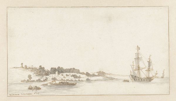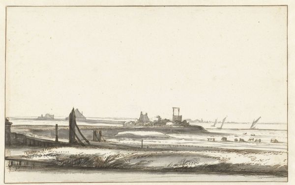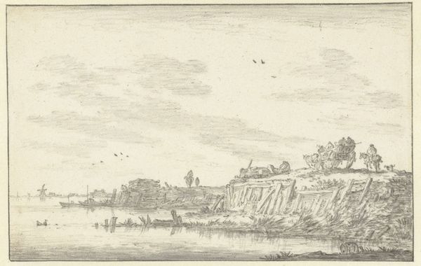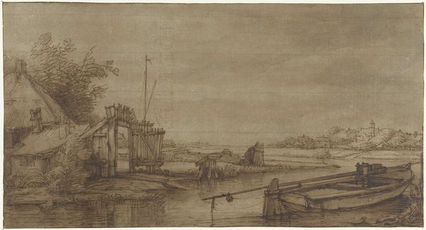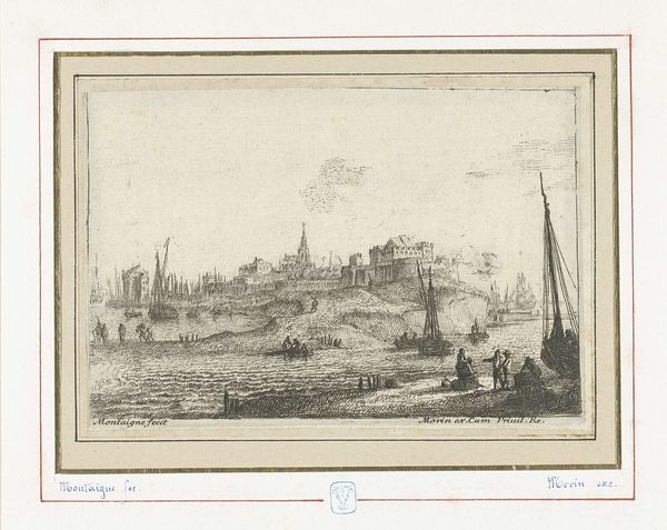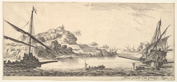 Curator: Here we have "View of the Seine with a City Gate on the Right Bank," created between 1631 and 1661. It’s a cityscape etched in ink, part of our drawings and prints collection. The artist is Israel Silvestre. Editor: It strikes me immediately as a study in contrasts, that looming tower set against the almost ethereal lightness of the sky. It evokes a sense of transition. Curator: I appreciate that read, especially as it emphasizes liminality. Israel Silvestre’s work is significant because of the ways it captures an urban landscape on the verge of transformation. The river wasn’t just a scenic backdrop but the very lifeblood, the trade route influencing class and power structures. What meanings do you see within the tower, given your background? Editor: The tower...it acts almost as a symbolic marker, doesn't it? Visually, it signifies authority and power. Vertically, it can represent aspirations, the ambition to reach higher. We also know, throughout history, towers have commonly embodied safety, while acting as a central hub of communal life. And given the context, placed directly by a city gate along a major river, it seems even more deliberately designed to signal stability, control and commerce. Curator: I find it fascinating that you brought up this relationship with trade and its influence on the social landscape. Silvestre operated in circles shaped by royal patronage. It really informs how he chose to represent—or perhaps legitimize—power. Even his use of the Baroque style suggests grandeur, supporting the status quo. Editor: Exactly. Every deliberate symbol subtly affirms cultural memory. It's intriguing to consider how artists shape and perpetuate established ideologies of their time, right? How visual choices continue to reflect underlying emotional weight for audiences throughout the centuries. Curator: It's a constant negotiation between representation and power. Thank you, your insightful reflections open the door to richer and more nuanced understandings. Editor: The pleasure was all mine! Hopefully we gave people a bit of context while making them aware of all this artwork can reflect.
