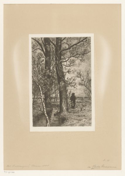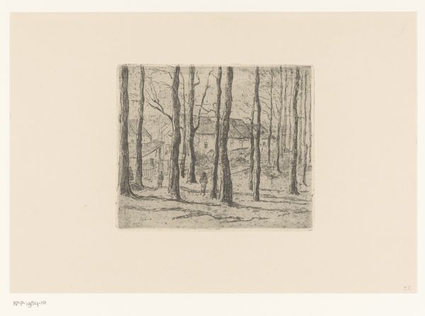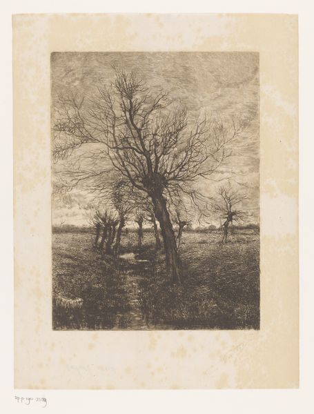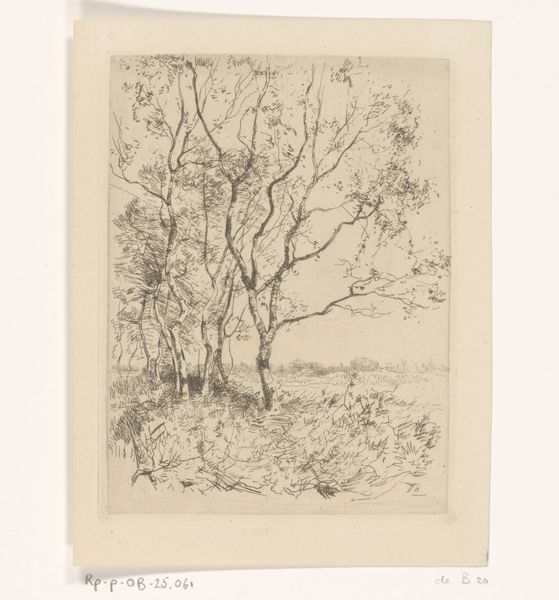 Curator: Here we have Willem Bastiaan Tholen’s “Bomenstudie,” created sometime between 1870 and 1931. It’s currently held at the Rijksmuseum. Editor: The immediate feeling is one of starkness. The trees are drawn with a raw, almost brutal simplicity. The composition, limited to monochrome lines, draws my eye into a dense web of branches. Curator: It’s remarkable how much he conveys with such restraint. Tholen worked largely in the realist and impressionist styles. You see that interest here in capturing the transient qualities of light on the bare branches and the texture of the woodland floor using dry-media. Editor: Precisely, it’s in those marks—the layering of the dry media to convey depth—that we start to decipher the mood. It seems melancholic. I think about the turn of the century, the art world burgeoning, institutions defining the artistic landscape, while Tholen meticulously documents something quietly somber, a lonely wood. Curator: That interpretation certainly has resonance given his historical context. He's painting at a time of social upheaval and these stark trees could symbolize social anxieties about landscape change. I would also look to the structural elements and see how Tholen plays with line and form. The network of lines, seemingly chaotic, in fact directs the eye into the central trees, giving a sense of depth through contrasts of light and shadow. Editor: Interesting. It speaks to how institutions like the Rijksmuseum have perhaps helped cement his role as an important recorder of landscape. There's certainly an element of national pride connected to the art depicting Dutch landscapes that Tholen would have been keenly aware of. He contributed, whether consciously or not, to a certain romanticized vision. Curator: Indeed. What appears as simply trees can tell a complex story about both aesthetic experience and cultural values. Editor: A poignant reminder that art offers so much more than surface beauty; it’s a testament to the intertwining of personal expression and historical moment. Curator: An exercise in seeing and feeling and a bridge into understanding the landscapes, both seen and imagined, of a particular era.