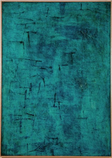 Kazuo Nakamura made this painting, Composition 10-51, with thin washes and delicate lines. It's like he's building up layers of atmosphere, a process that feels almost like drawing in slow motion. Up close, the surface is really interesting. The paint is so thin in places you can see the texture of the canvas coming through, especially in the pale yellows and blues. Then there are these intricate, almost architectural lines scratched on top. Look at the dark rectangle just above the center – it’s like a little anchor in this web of lines, a focal point that holds the whole composition together. I like how the lines are kind of shaky and uneven, you can feel the artist's hand moving across the surface. Nakamura’s work reminds me a bit of Agnes Martin's grids, but with a more organic feel. It’s about finding structure in chaos, and embracing the beauty of imperfection. It invites you to slow down and look closely, to get lost in its subtle details.