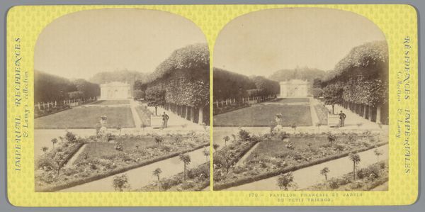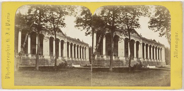 Editor: So, this is "Promenade langs de zuilengalerij richting het Pavilon Křížového pramene, Mariánské Lázně," taken between 1855 and 1868 by František Fridrich. It’s an albumen print depicting a colonnade and pavilion. The subdued tones give it a kind of timeless, melancholic feel. How do you interpret this work in its historical context? Curator: That melancholic feeling you’re picking up on, I think, is tied to the social history of places like Mariánské Lázně. These were spaces of leisure and recuperation, but also sites of intense social stratification. Who had access to these spas, and who was excluded? Consider the individuals pictured – their posture, their clothing; what stories do they tell about the power dynamics at play? Editor: That’s a great point! I hadn't considered the power dynamics within leisure. Are you suggesting that the photograph isn’t just a neutral documentation, but a record of those hierarchies? Curator: Exactly. Photography in the 19th century was never truly neutral. It was a tool used to construct and reinforce social norms. This image might present an idyllic scene, but beneath the surface are complex layers of class, privilege, and access. The architecture itself – the colonnade, the pavilion – speaks to a certain kind of aspirational lifestyle, available only to a select few. Editor: It's almost like the architecture performs a function beyond providing shelter, projecting an image of exclusivity and power. Is there something more we could unpack about the composition itself, perhaps the photographer's choice of perspective? Curator: The photographer's decision to emphasize the receding colonnade and distant pavilion creates a sense of depth, but also perhaps a sense of unattainability. Think about how this imagery may have influenced the way different social groups were represented, not just in photography, but more broadly across visual culture. Who was behind the lens, and what narratives were they crafting, consciously or unconsciously? Editor: Wow, that totally shifts how I see it. It's not just a pretty landscape, but a statement about social positioning. Thanks for highlighting those aspects! Curator: My pleasure. It’s crucial to read these images not as simple reflections of reality, but as complex cultural artifacts that can inform us of the underlying biases, norms, and ideologies that define us as a society.