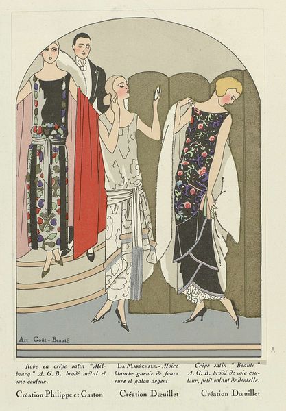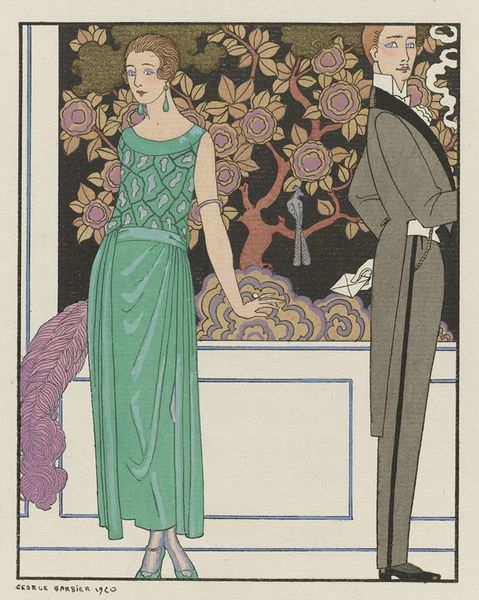 George Barbier created “Des robes dans la nuit” as a fashion plate, a printed illustration from 1921 intended to showcase the designs of the House of Worth. The printmaking process – likely pochoir, a type of stenciling – is key here. It allowed for the application of flat, vivid colors, ideal for capturing the luxurious textiles and intricate detailing of the evening gown. Consider the context: Worth was a leading Parisian couture house, synonymous with exclusivity and high-end craftsmanship. Barbier’s image would have been circulated among elite clientele, offering a tantalizing glimpse into the latest trends. The dress itself, with its fluid lines and understated embellishments, reflects the era’s embrace of modern elegance. Yet the print also subtly reveals the labor and artistry involved in haute couture, from the skilled hands that crafted the garment to the artisans who meticulously produced the fashion plate. Barbier's print invites us to appreciate not only the finished product, but also the network of making that brought it into being. It’s a reminder that even in the realm of high fashion, craft and process are always at play.