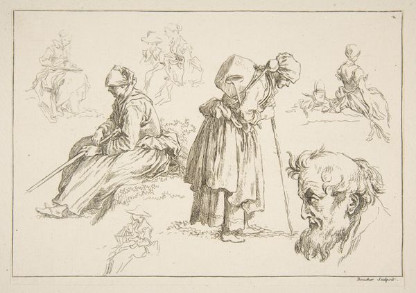 This sheet of sketches was etched by François Boucher, inviting us into his preliminary explorations. Notice the recurring motif: figures adorned with simple caps and hats. In Boucher’s time, these head coverings weren't mere fashion, but symbols of the working class. The reclining figure, with the cap pulled low, echoes poses we find in classical depictions of slumbering nymphs or even allegories of melancholy. Yet, here, the gesture is grounded, brought down to earth. Think of similar poses throughout art history, the sleeping Ariadne, or even figures in pastoral scenes. Each time, the posture carries a weight of vulnerability and introspection, yet here it seems deflated, quotidian. Such archetypes recur across time, shaped and reshaped by collective memory and the ever-shifting tides of culture. What was once divine becomes human, what was tragic becomes commonplace, revealing how deeply the past is etched into the present.