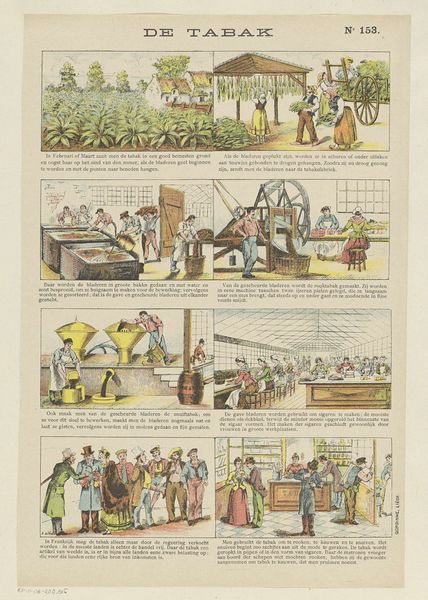 "De zwerftochten van een houten soldaat", or "The wanderings of a wooden soldier" by Pellerin & Cie, is a captivating early print. Its grid-like composition, divided into narrative panels, immediately draws the eye across the whimsical journey of the toy soldier. The soft hues and gentle linework evoke a nostalgic charm, hinting at simpler times and childhood reveries. The soldier's adventures, rendered in distinct vignettes, take us through varied landscapes and encounters. Each frame presents a microcosm, yet they collectively form a cohesive narrative. The materiality of the print, with its flat, somewhat naive rendering, speaks to the print's function as a popular visual medium. The division into panels also echoes structuralist ideas about language and narrative, where meaning emerges from the structured relationships between individual units. Observe how the print’s organization invites us to decode the soldier’s story, reflecting how visual narratives convey meaning through structured sequences. This piece isn't merely a depiction of adventure; it’s an exploration of storytelling itself.