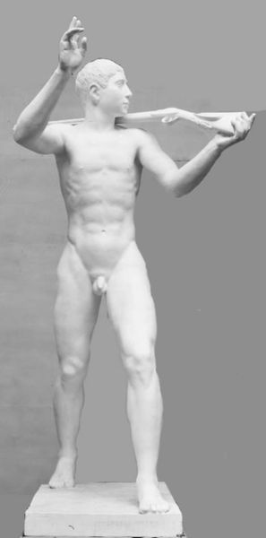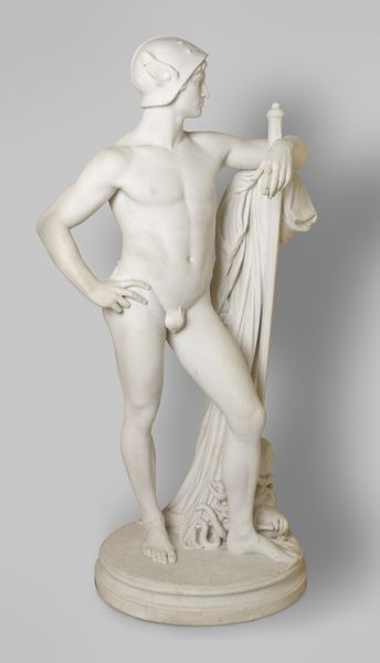 Curator: This striking marble sculpture, carved by Louis Hasselriis in 1870, is titled "Before the Victory". It resides here at the SMK, the National Gallery of Denmark. Editor: My initial impression is one of serene strength, and quiet contemplation. There's a certain polished tension in the figure, from the carefully carved musculature to the positioning of his hands behind his back. Curator: Indeed. Hasselriis, deeply inspired by classical Greek and Roman sculpture, was attempting to tap into an artistic tradition heavily imbued with ideas of civic duty, and ideals of masculine strength as service to the state. The artist's production was very rooted in the rising nationalist sentiments that were felt across Europe at this moment in time. Editor: Looking at the sculpture formally, I notice how Hasselriis creates a dialogue between smoothness and texture. The skin is almost porcelain, whereas the draped cloth and roughly textured tree stump at his feet contrast sharply. And note the figure is rendered in full contrapposto. The head is turned away from the weight bearing leg – he’s a poised figure of perfect balance. Curator: Consider also, the symbolism embedded in the disc that the figure holds. This echoes classical depictions of athletes – figures lauded for their physical prowess and contributions to society through displays of sporting excellence. I'd argue that Hasselriis is making a subtle comment on the value that society places on particular displays of masculine power. Editor: And perhaps an acknowledgment of their inherent vulnerability. His hands are clasped behind his back. A disc offers meager protection. He looks pensively off to the side. The form expresses this vulnerability; despite the muscular physique, there is a fragility communicated through a masterful study of gesture. Curator: The late nineteenth century saw an explosion of neoclassical sculptures across Europe. I see Hasselriis’s sculpture as fitting very neatly within the tastes and demands of powerful state institutions and wealthy patrons seeking to reinforce classical values through public art. Editor: Yes, there's a compelling discussion to be had between the individual strength captured in the piece versus the institutional needs being fulfilled. A balance, perfectly articulated by Hasselriis’ deft hand and eye. Curator: A powerful statement indeed, rooted in the complex interplay between artistic form, political will, and the cultural milieu that birthed it.