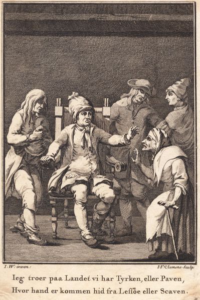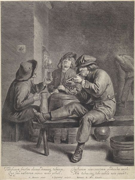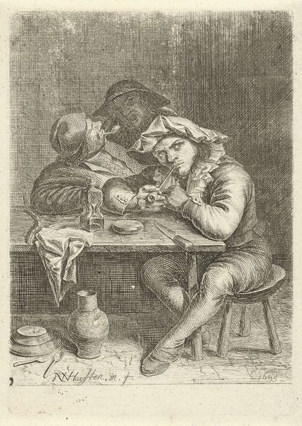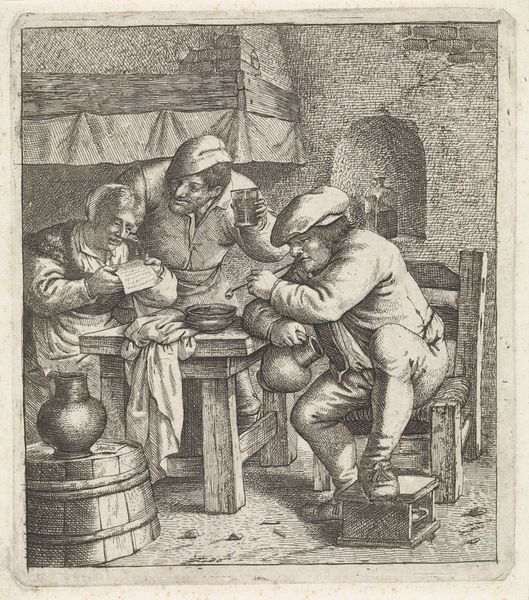 Jan Naning created this etching of "Three Peasants around a Table," capturing a seemingly candid moment. The image provides a glimpse into the lives of rural working-class men and how they may have spent their leisure time. The men depicted are engaged in simple pleasures: drinking, smoking, and perhaps gambling, suggested by the cards on the floor. This imagery can be viewed through the lens of class and cultural identity, contrasting with the more idealized or heroic portrayals of the wealthy class. The scene evokes a sense of community and shared experience among these men. We get the sense they are not putting on airs, they're just being themselves. However, this seemingly innocent snapshot also raises questions about representation and the male gaze. Are we, as viewers, intruding on a private moment, or are we being invited to observe and perhaps judge these men and their choices?