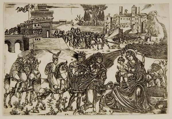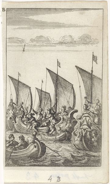 Editor: This is Utagawa Hiroshige's "URAURA TAIRYO NO SU." The print depicts many figures pulling fishing boats in from the sea. The use of line and the composition gives a feeling of bustling activity, but what strikes you most about this piece? Curator: The composition is indeed dynamic. Note the careful arrangement of the figures and boats, creating a rhythm across the picture plane. How do you interpret the relationship between the foreground figures and the background boats? Editor: It seems to create depth, but also a contrast between the labor on land and the activity on the water. It's like two separate scenes connected by the rope. Curator: Precisely. The rope acts as a visual link, uniting the two planes into a cohesive design. Consider the use of color and the subtle variations in line. Editor: It's amazing how much detail is conveyed with such simple lines and a limited palette. Curator: Indeed, it's a masterful example of utilizing the intrinsic elements to create a rich visual experience. Editor: Thanks. I see so much more now.