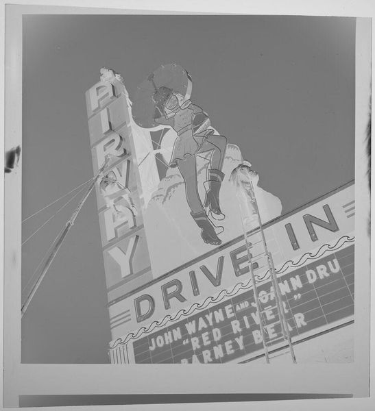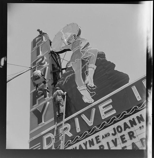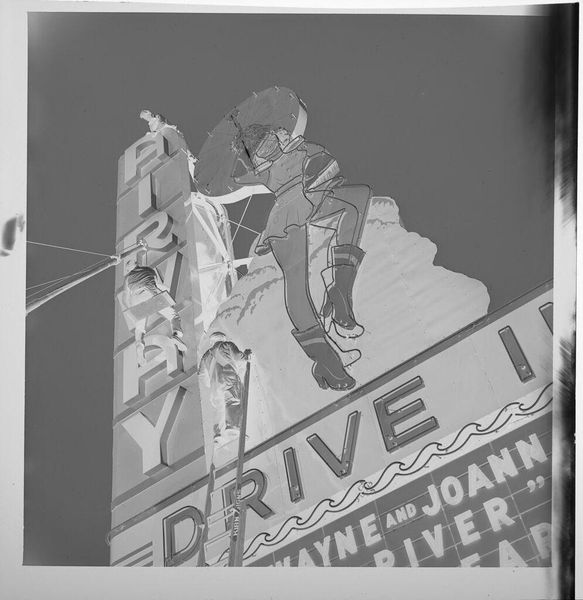 Editor: So this is Jack Gould's "Untitled (neon sign for drive-in theater)." It's a small photograph. What strikes me is the way this sign romanticizes the drive-in experience. What do you see when you look at this? Curator: The signage reflects how drive-ins were marketed as affordable entertainment havens, particularly for families during the postwar boom. Notice the towering figure of a carhop, juxtaposed with names like "Joanne Dru," promising escapism through celebrity culture. Editor: That makes sense. So it's about selling the American Dream? Curator: Exactly! It catered to a specific social desire for leisure and community, while subtly reinforcing gender roles of the time. Consider the car itself, almost another character promising freedom. Is that something you picked up on? Editor: I didn't, but now I see the cultural narrative. Thanks for pointing that out! Curator: My pleasure. It's fascinating how a simple sign can reveal so much about societal values.
