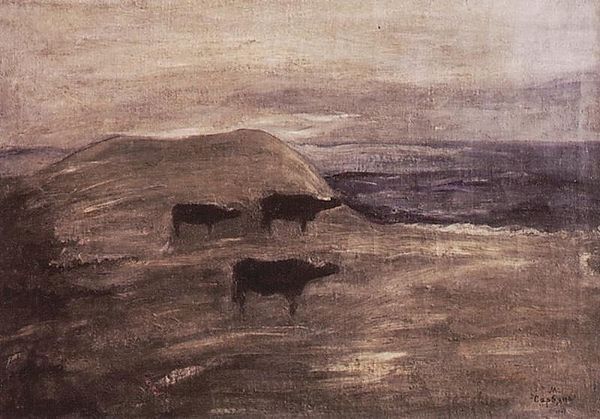 Editor: This is "Two Horses in a Pasture," painted by Edgar Degas in 1871. It's an oil painting. The hazy scene and muted colors give it such a calm, serene feel. What stands out to you from a formal perspective? Curator: Note the horizon line; it dissects the picture plane with minimal deviation and sits relatively low. The texture of the canvas itself becomes an integral element. Editor: Interesting! I was focusing more on the figures. Curator: While representational forms are discernible, are they delineated with precision? Degas uses color, mass, and shadow instead. How do the figures and the landscape interact formally? Editor: They kind of blend, especially since they're both variations of muted greens and browns. The horses almost emerge from the pasture itself. It is like they are one. Curator: Precisely. This effect is heightened by the lack of sharp outlines. Light and shadow define form but in an ambiguous way. Look at how the application of paint on the top contrasts that on the bottom. Editor: It is much looser, especially in the sky area, which almost resembles a Rothko color field. What would you say is the dominant element here, then? Curator: I'd argue that the interplay of color and texture, overriding clear representational intent, constitutes the work's primary formal concern. Did you note that there's barely any contour? Editor: Right, no hard lines, everything is soft and diffused. It’s amazing how much a formal analysis can reveal about a piece. Curator: Absolutely, by examining these formal elements, we can decipher much about Degas’s visual language.