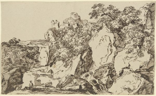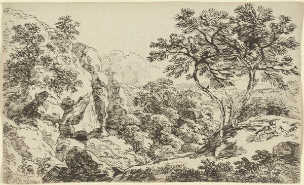 Allart van Everdingen created this print called, "Two Men Seated at the Foot of a High Rock" during the Dutch Golden Age. As the Dutch Republic expanded its trade routes, artists like Everdingen found inspiration in the natural world. Here, we see two figures dwarfed by a massive rock formation, which suggests the sublime power of nature. Consider the era’s interest in the self and individualism. The men seem contemplative, perhaps seeking solace or enlightenment in this rugged landscape. One can almost feel the weight of the rock, the quiet rustling of leaves, and the vastness of the open sky. It’s worth noting that during this period, class distinctions were pronounced, with the merchant class gaining prominence. Did Everdingen intend to convey a sense of humility or perhaps the insignificance of human endeavors against the backdrop of the natural world? How might this image reflect or challenge the societal norms of the time? I wonder what he would say.