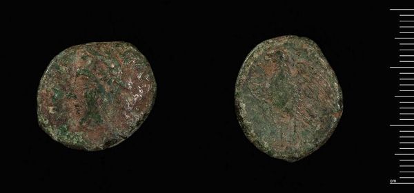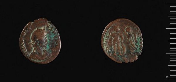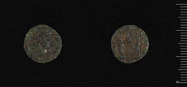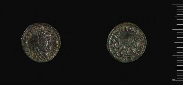 Curator: Before us we have a small bronze coin, an AE4 to be exact, of Arcadius, minted in Alexandria. Editor: It looks so worn and muted, almost like a whisper from a bygone era. What would this have represented for people at the time? Curator: These coins served not just as currency but also as miniature billboards, spreading the emperor's image and legitimacy. The imagery speaks of power, faith, and Romanitas. Editor: Power certainly built on exploitation, though. I wonder about the conditions of laborers in Alexandrian mints and how the imperial image impacted them. How did their labor contribute to Arcadius’ authority? Curator: A worthwhile consideration indeed. The coin’s iconography, although somewhat faded, suggests the continuity of Roman authority, resonating with established cultural memory, yet also subject to the shifting sands of political change. Editor: And now, as an artifact, it reminds us to question how power structures were, and still are, supported. The past is never truly past, is it?