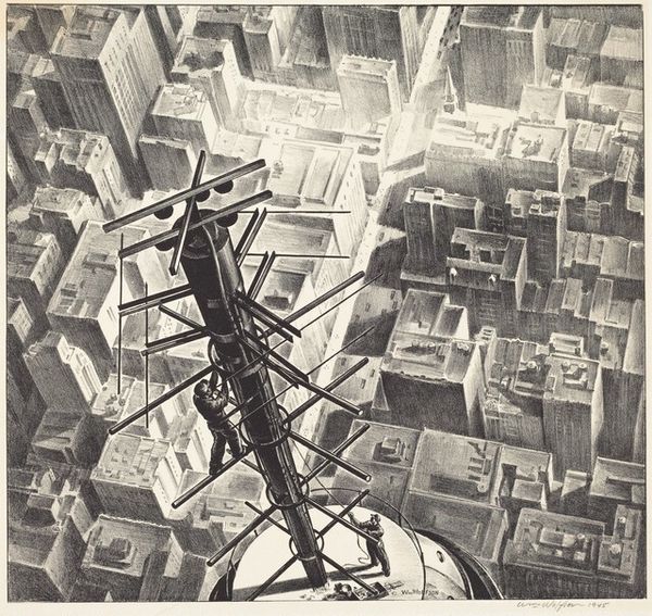 Curator: Here we have an untitled print by Sir Eduardo Paolozzi. The work is held in the Tate Collections. Editor: The density of the city, rendered in monochrome, creates a feeling of overwhelming urban sprawl. Curator: Paolozzi often explored the intersection of technology and urban life. Consider how the bridge, a symbol of connection, is here overwhelmed by traffic, hinting at both progress and alienation. Editor: Yes, and I read that as a critique of capitalist excess and its impact on working-class lives, turning people into mere cogs within an uncaring machine. Curator: Perhaps. Or maybe he's just documenting the formal tensions between organic and inorganic forms within our rapidly changing environment. Editor: It’s a useful reminder of how art can provoke critical conversations about our collective experience. Curator: Indeed, it's a dynamic composition.