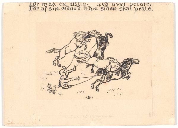 Editor: This small print, "Water Call," by an anonymous artist, shows a rider taking an unexpected dip. It's so comical! What's your read on its cultural relevance? Curator: Well, considering the imagery of men on horseback, especially in this precarious situation, points to a certain societal class being lampooned. The "Water Call" might be a subtle critique of the elite's perceived clumsiness or detachment from practical matters. What do you think of this interpretation? Editor: That's insightful! I hadn't considered it as social commentary. Curator: It's fascinating how a seemingly simple image can reflect broader power dynamics. Editor: I'll definitely look at art with a more critical eye now.