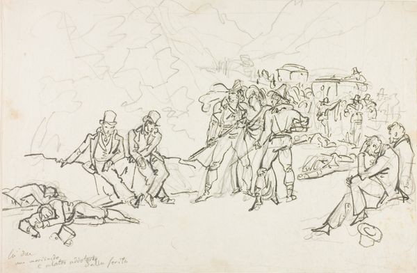 Curator: This is Leon Kossoff's "Outside Kilburn Underground", a stage proof etching currently residing in the Tate Collections. Editor: There's such nervous energy in these lines. It feels like a crowd seen through rain-streaked glass, all anonymity and hurried purpose. Curator: Note how Kossoff's dense, almost frenetic mark-making constructs space. The composition fractures perspective, denying any easy reading of depth. Editor: The recurring motif of the London Underground carries significant cultural weight, doesn't it? It's a symbol of transit, of anonymity, of the everyday struggle. Curator: Precisely. The work isn't about accurate depiction. It’s about constructing a visual language through line, a language that echoes the chaotic pulse of urban existence. Editor: The faceless figures, all rendered with such raw emotion, could be anyone, anywhere. That universality speaks to the deeper, shared human experience of city life. Curator: A successful distillation, then, of lived experience into pure form. Editor: Indeed. Kossoff transforms the mundane into something profoundly resonant.