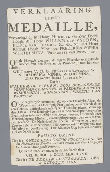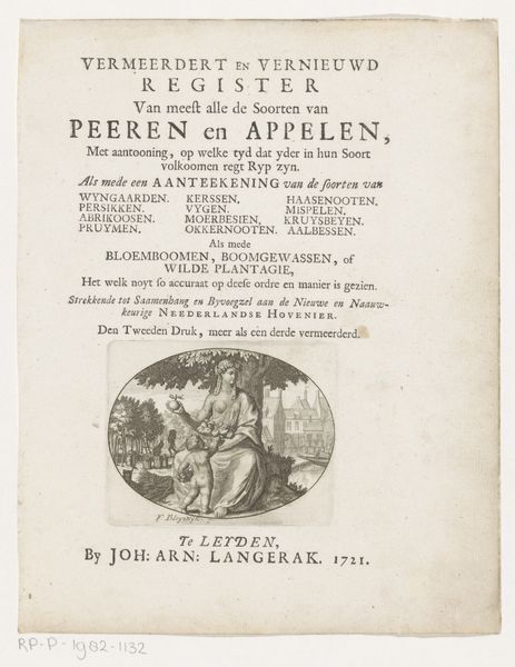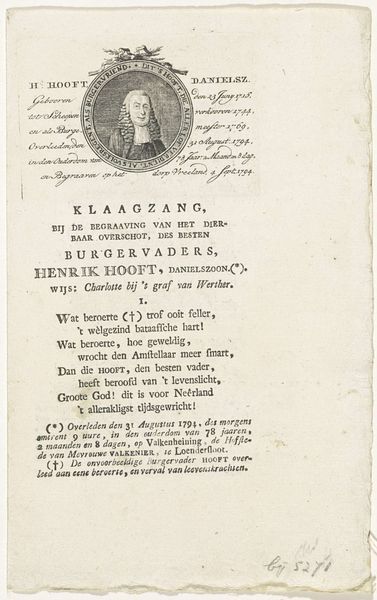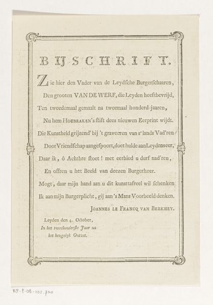 Editor: This is an engraving from 1774, titled "Tekstblad behorende bij het portret van Pieter Adriaansz. van der Werf," or Text Sheet belonging to the portrait of Pieter Adriaansz. van der Werf, by Johannes le Francq van Berkhey. It’s mostly text inside an ornate frame. What’s the story here? What am I looking at? Curator: At its heart, this engraving functions as a carefully constructed symbol of civic virtue and remembrance. Van Berkhey’s inscription essentially canonizes Pieter Adriaansz. van der Werf. Consider the title “Handhaaver der Vrijheid”—Guardian of Freedom. It elevates Van der Werf to a near-mythic status, doesn’t it? How does the visual presentation of text within a framed border impact the way the viewer perceives it? Editor: It feels like an official document, but also…art. So it’s meant to be both informative and celebratory? A little bit like a monument then? Curator: Precisely! Monuments serve to preserve cultural memory. Look at phrases like “grijzend bij ‘t graveeren van ‘s Lands Vadren” - “graying while engraving the fathers of the country”. Do you think Van Berkhey implies tradition and reverence? He links this image, this printed word, to a longer history, suggesting that Van der Werf, too, now belongs to the lineage of celebrated figures. The text itself becomes a symbol. Editor: So, it’s not just about what the words say, but what they represent, and what van Berkhey wanted them to represent for viewers then and now. Curator: Exactly. It invites reflection on duty, artistic legacy, and the power of images to shape our understanding of the past. Think about how these symbols worked in the 18th century, and the historical and political context in which this piece came into existence. Editor: I hadn't thought about how much meaning can be embedded in what seems like a simple text. The frame, the wording - everything seems carefully chosen to create a specific impression. Thanks! Curator: My pleasure! It’s through examining such details that we uncover the lasting impact of visual language and its ability to echo through time.