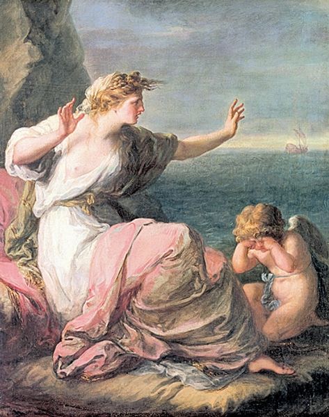 Editor: Angelica Kauffmann’s 1774 oil painting, "Ariadne Abandoned by Theseus," portrays a scene of intense solitude and grief. The desolate landscape amplifies Ariadne's emotional state. What symbols do you see embedded within this work? Curator: Notice first her posture. She’s reclining, almost collapsing, mirroring the ruined, rocky landscape around her. The box overflowing with jewels – does that not speak volumes about what Theseus has left behind versus what he’s taken away? Wealth is nothing without love, the continuity of their bond severed. The fleeing ship becomes a symbol of betrayal, fading on the horizon of her hopes. What does it stir in you? Editor: It’s overwhelmingly sad. I see how the jewelry, normally a symbol of status and beauty, becomes meaningless in her despair. And the distant ship just twists the knife, really emphasizing her isolation. Curator: Exactly. Kaufmann is masterful at using classical themes to explore female emotion and agency, or lack thereof. Consider the cultural memory tied to Ariadne, always depicted as a woman wronged by a man. This is a repeating story, wouldn't you say? And the dark tones versus her illuminated white gown – what do you make of this sharp contrast? Editor: That’s such a great point about her portrayal. It definitely shifts the focus onto Ariadne's inner world and her experience of abandonment. The stark lighting creates an almost unbearable emotional intensity. It’s not just about the story but about the lingering feeling. Curator: The symbolism within works such as these help the viewer connect to the artwork through a powerful connection of recognition. Ultimately, Kauffman prompts us to look inward, to question how such archetypes resonate, still, in modern emotional life. Editor: Thank you. Seeing all the layers within the artwork, from classical myth to its emotional power, is eye-opening. I’ll definitely consider cultural memory and continuity in my analysis moving forward.